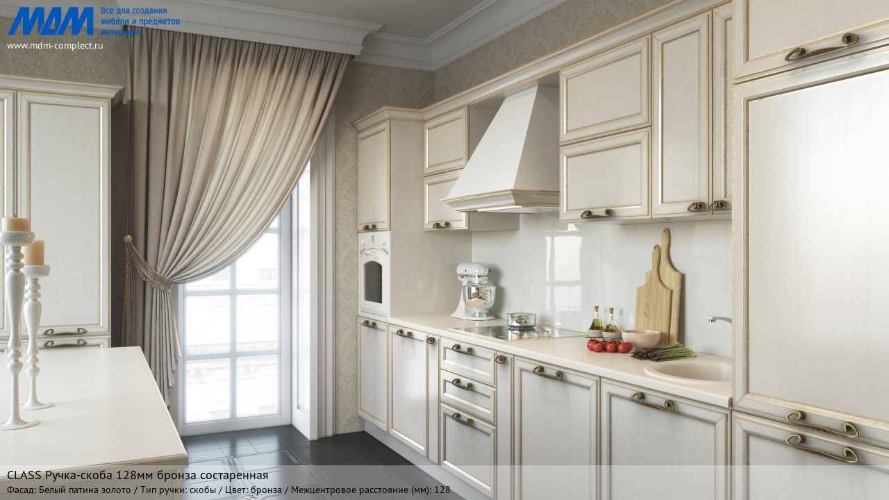 Мебельная class ручка-скоба 128мм бронза состаренная на различных фасадах в кухонном интерьере в стиле классика.