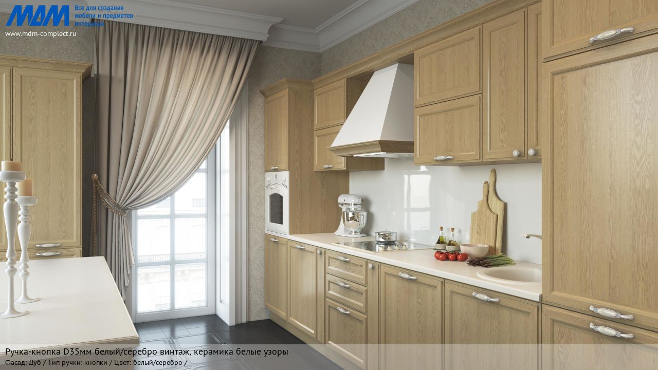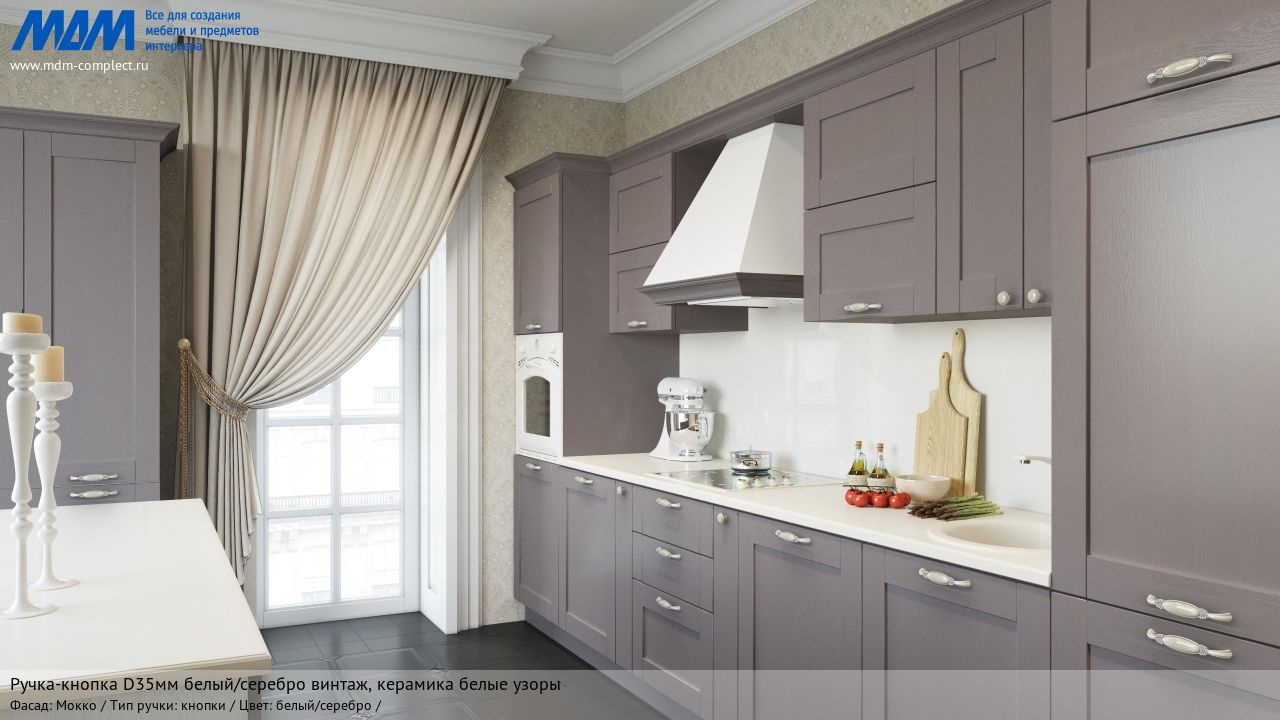 Мебельная ручка-кнопка d35мм белый/серебро винтаж, керамика белые узоры на различных фасадах в кухонном интерьере в стиле классика.