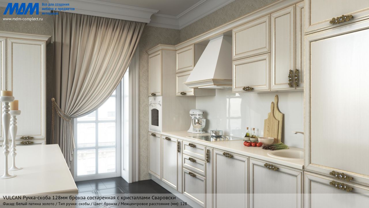 Мебельная vulcan ручка-скоба 128мм бронза состаренная с кристаллами сваровски на различных фасадах в кухонном интерьере в стиле классика.