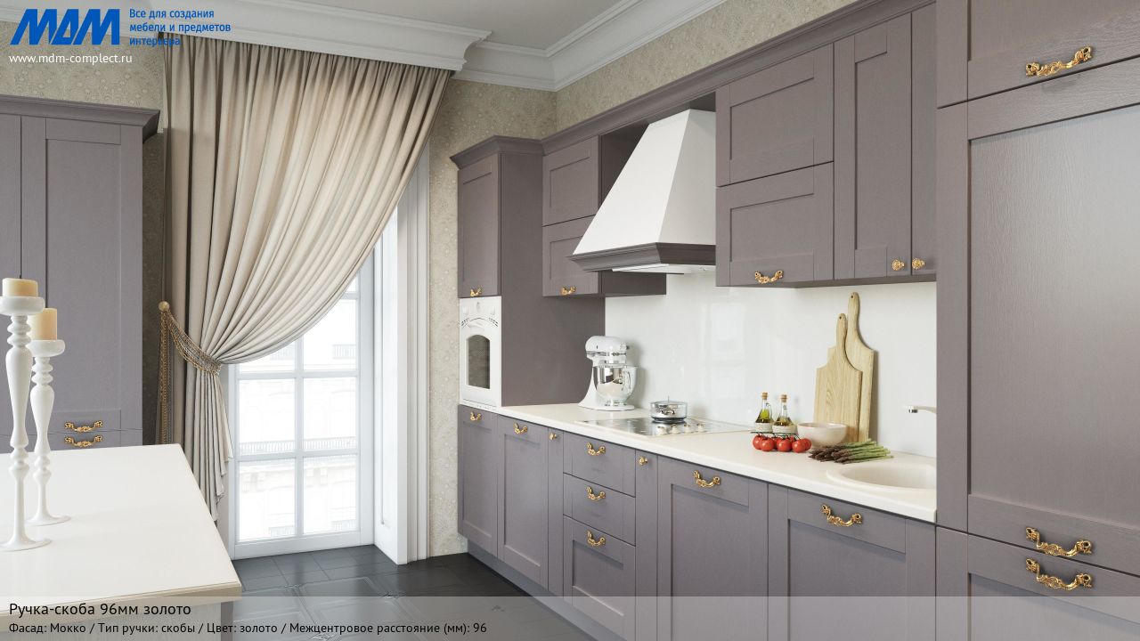 Ручка-скоба 96мм золото (WMN.631.096.00GP) в готовой кухне на различных фасадах, стиль классика