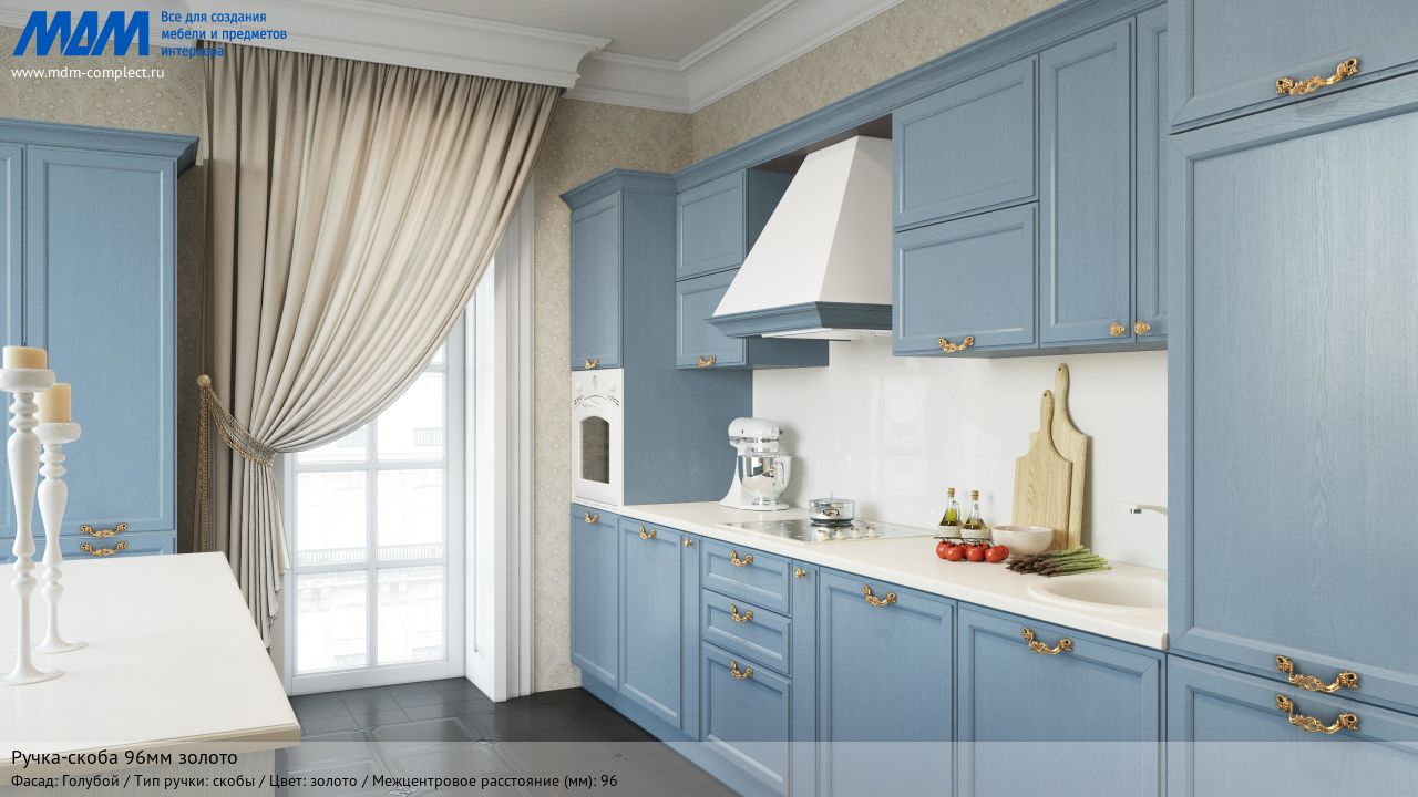 Мебельная ручка-скоба 96мм золото на различных фасадах в кухонном интерьере в стиле классика.