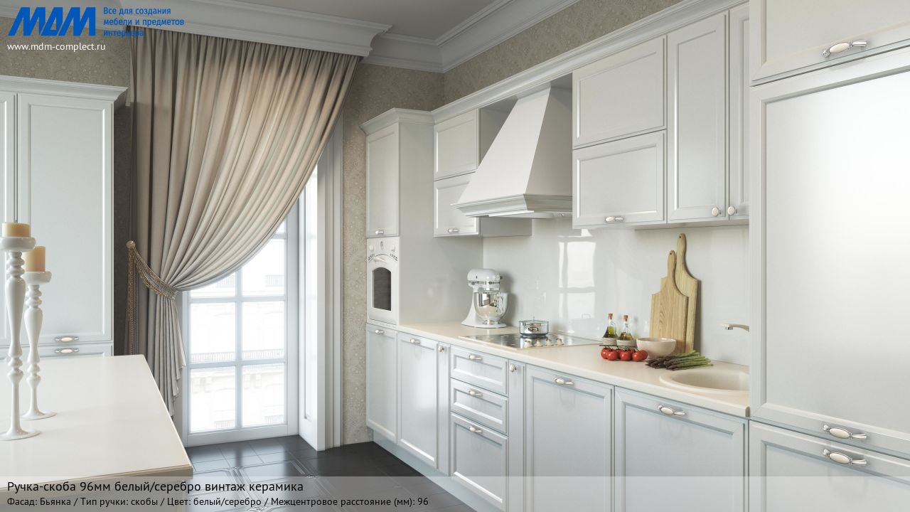 Ручка-скоба 96мм белый/серебро винтаж керамика (WMN.68.01.00.096.T4) в готовой кухне на различных фасадах, стиль классика