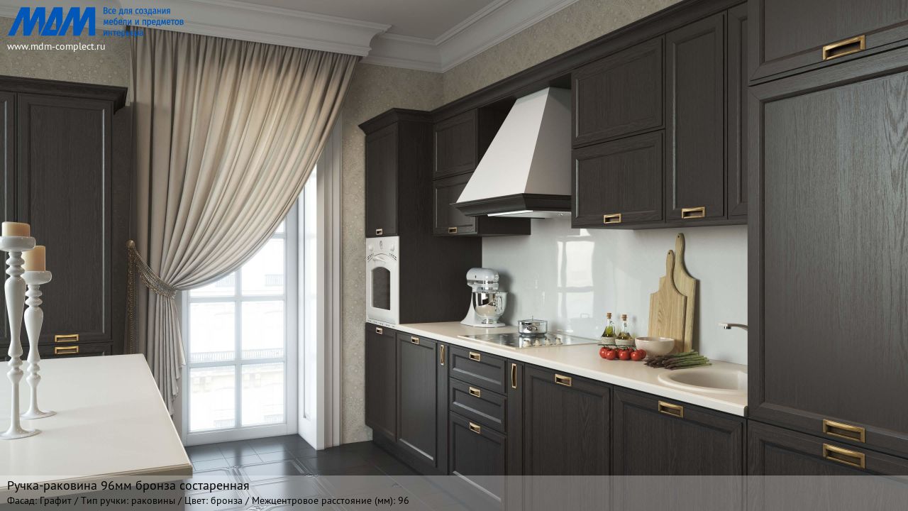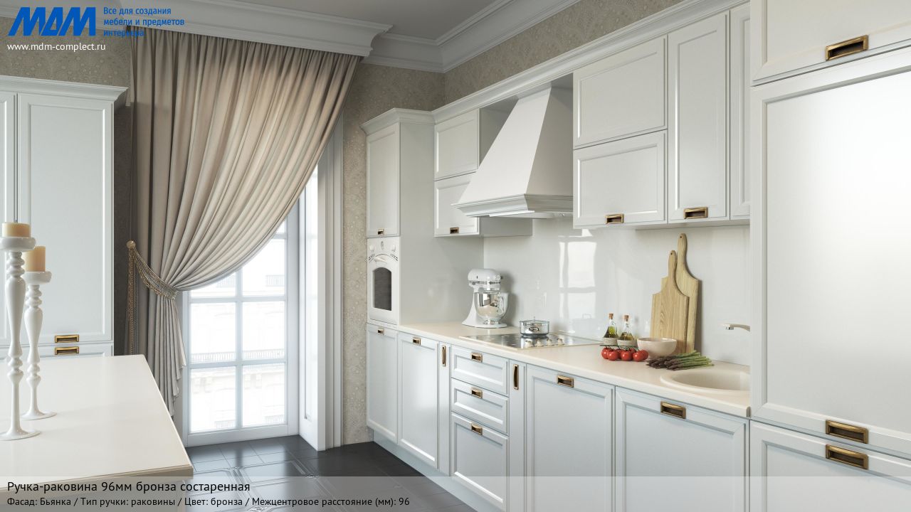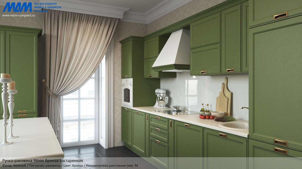 Мебельная ручка-раковина 96мм бронза состаренная на различных фасадах в кухонном интерьере в стиле классика.