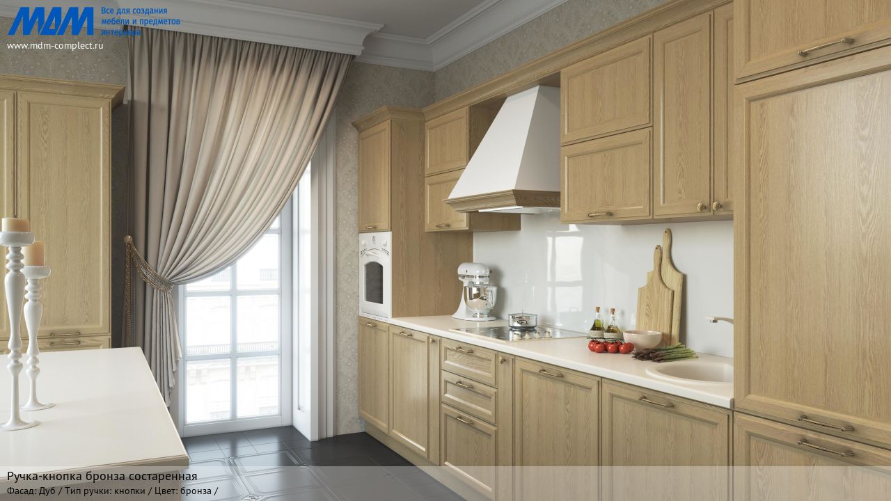 Мебельная ручка-кнопка бронза состаренная на различных фасадах в кухонном интерьере в стиле классика.
