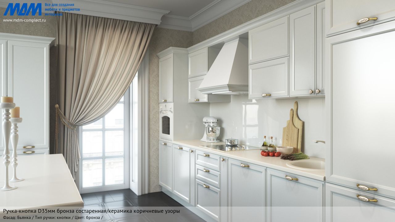 Мебельная ручка-кнопка d35мм бронза состаренная/керамика коричневые узоры на различных фасадах в кухонном интерьере в стиле классика.