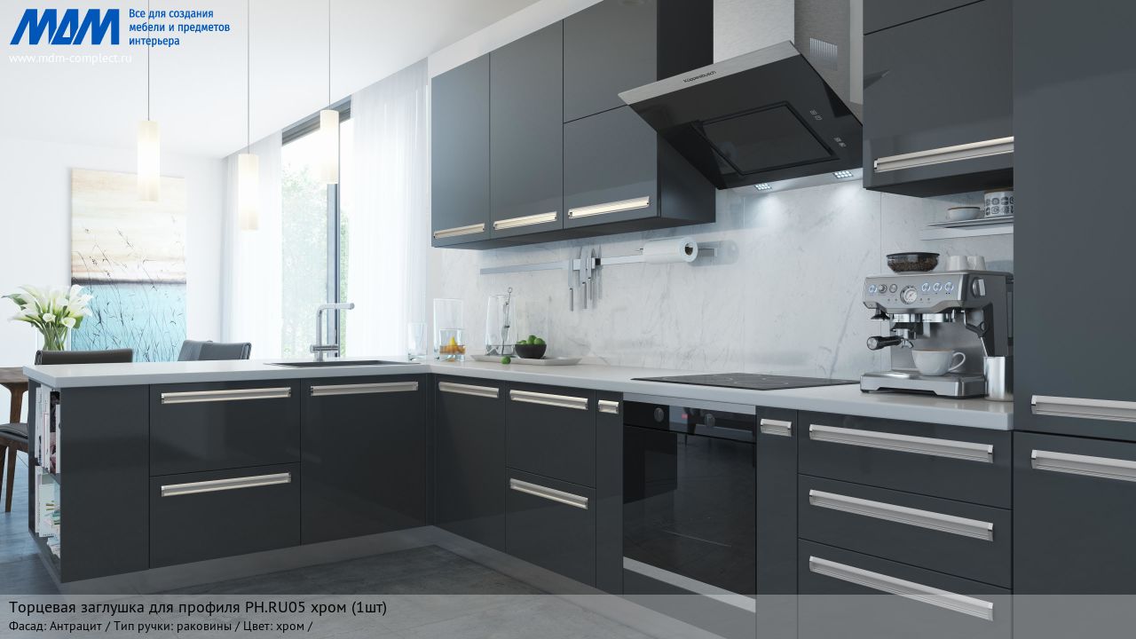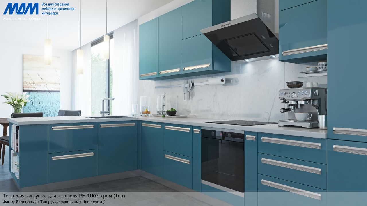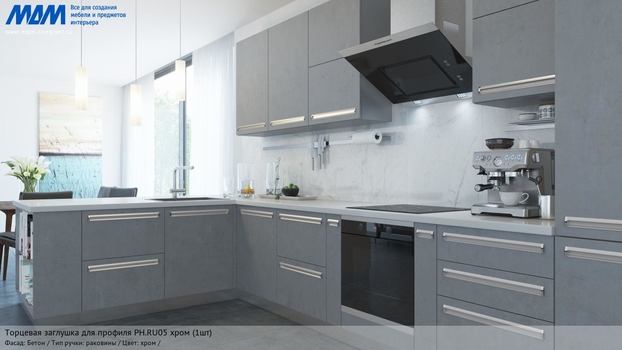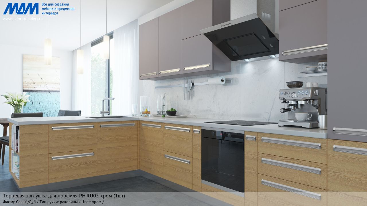 Мебельная торцевая заглушка для профиля ph.ru05 хром (1шт) на различных фасадах в кухонном интерьере в стиле модерн.