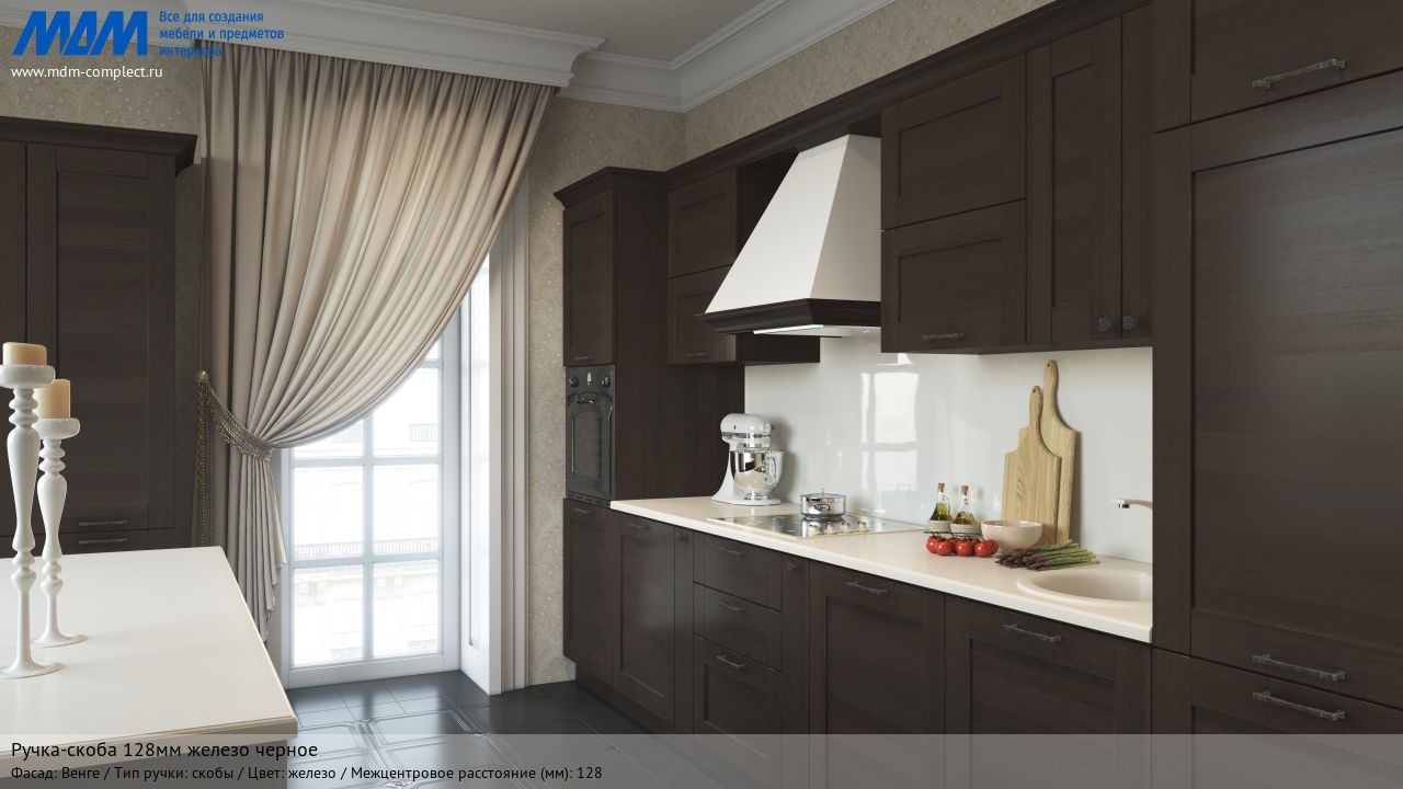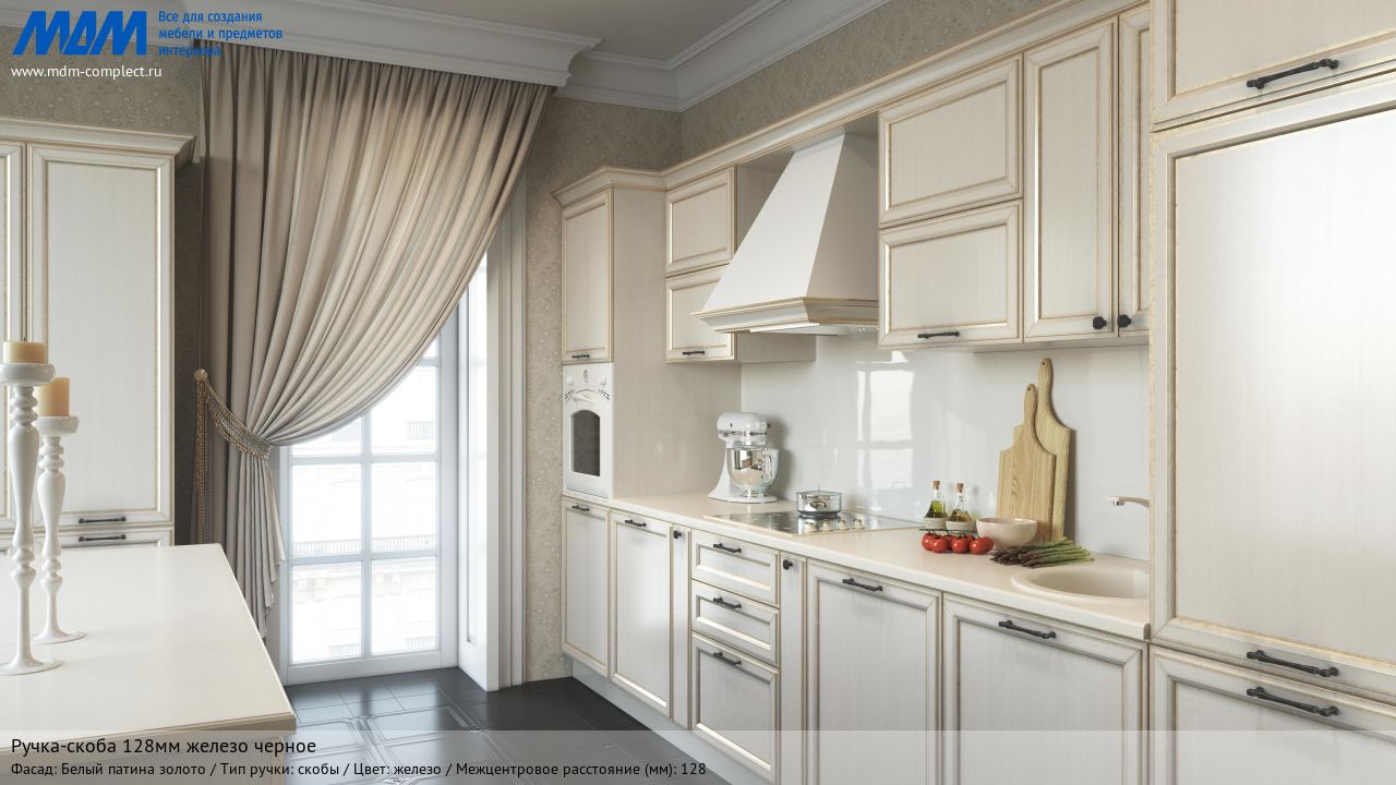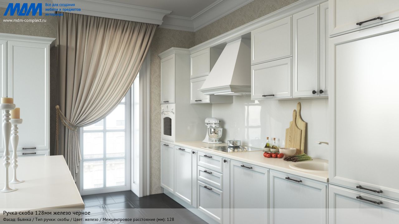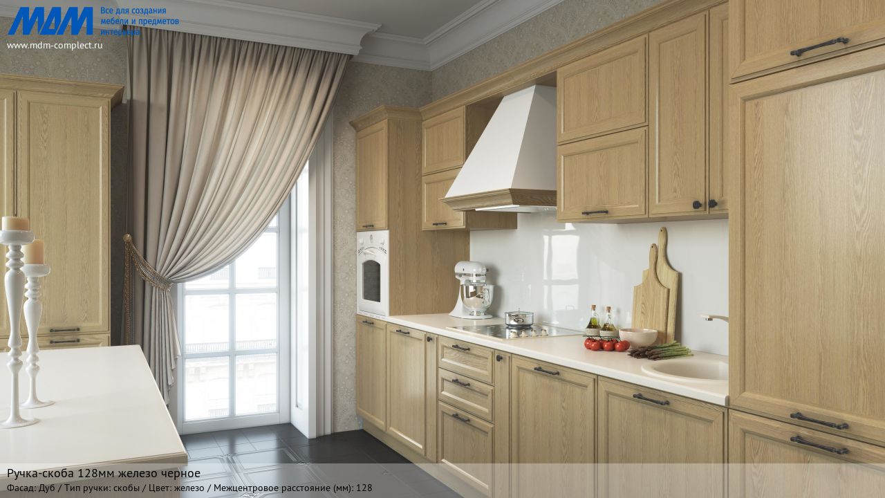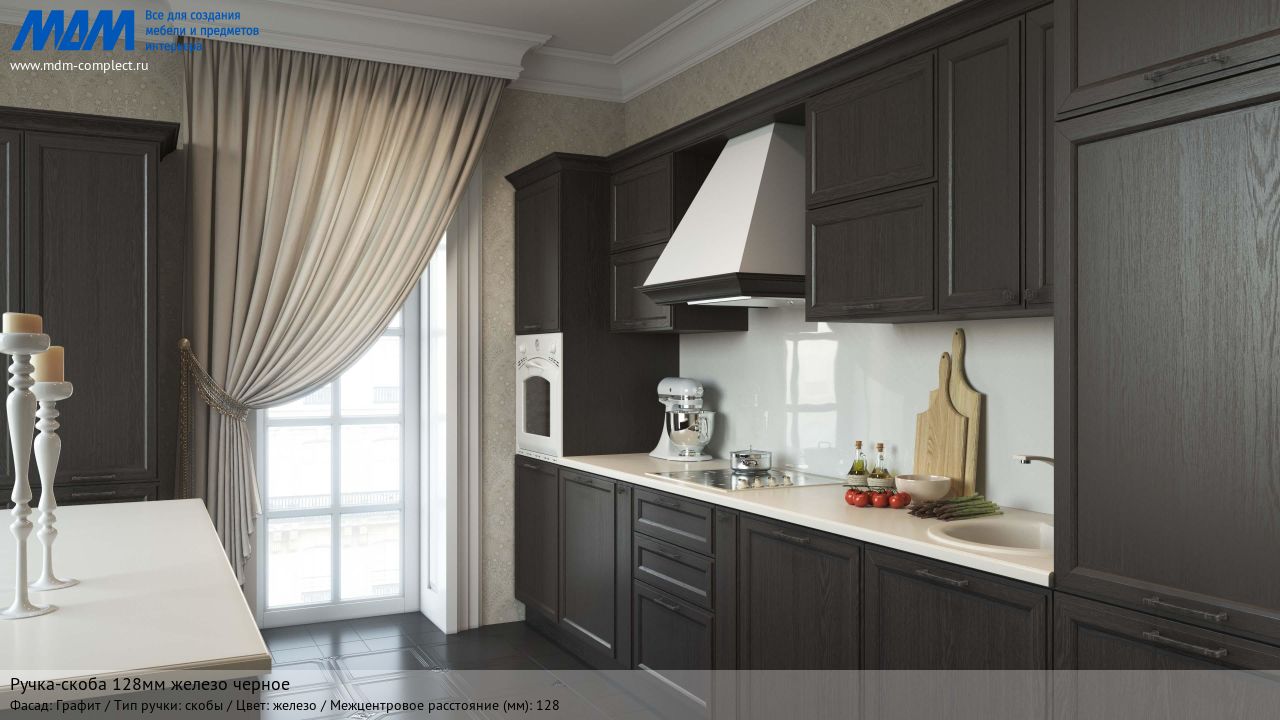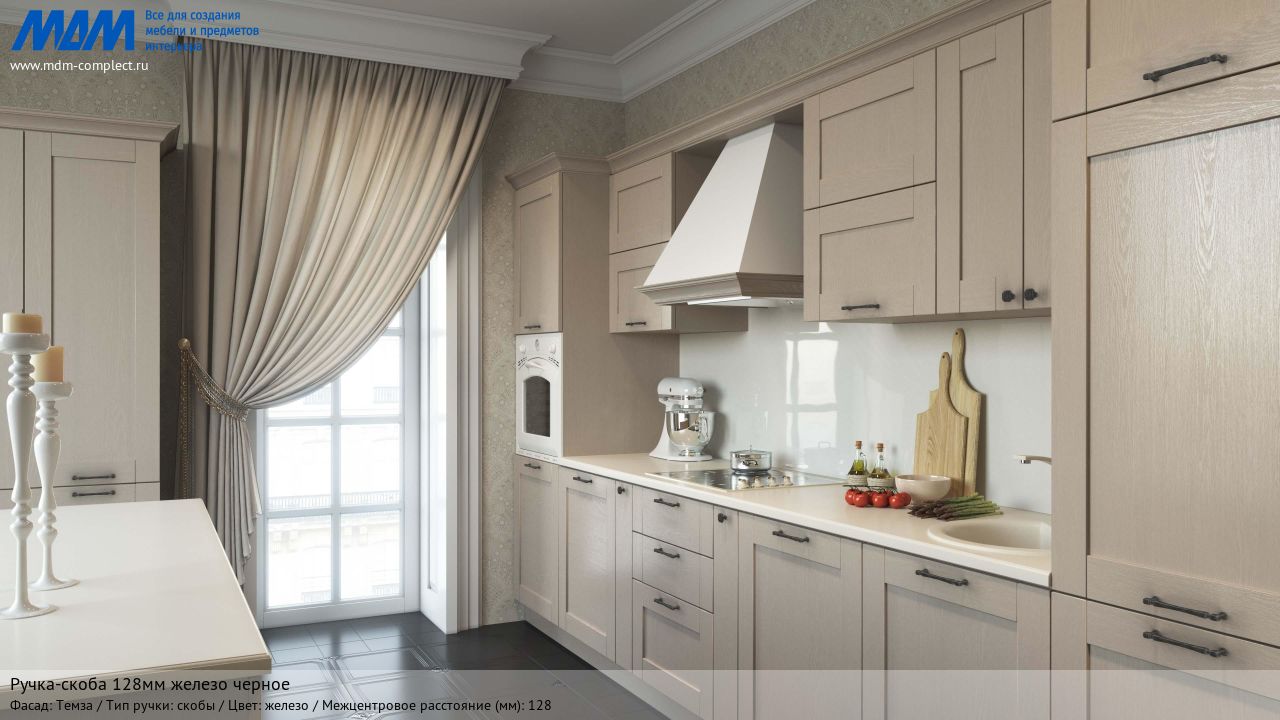Мебельная ручка-скоба 128мм железо черное на различных фасадах в кухонном интерьере в стиле классика.