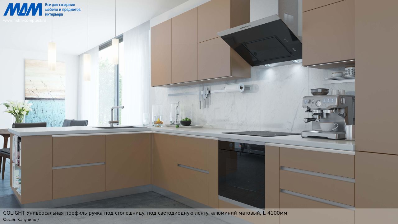 Мебельная golight универсальная профиль-ручка под столешницу, под светодиодную ленту, алюминий матовый (анод), l-4100мм на различных фасадах в кухонном интерьере в стиле модерн.