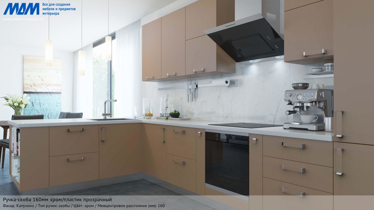 Мебельная ручка-скоба 160мм хром/пластик прозрачный на различных фасадах в кухонном интерьере в стиле модерн.