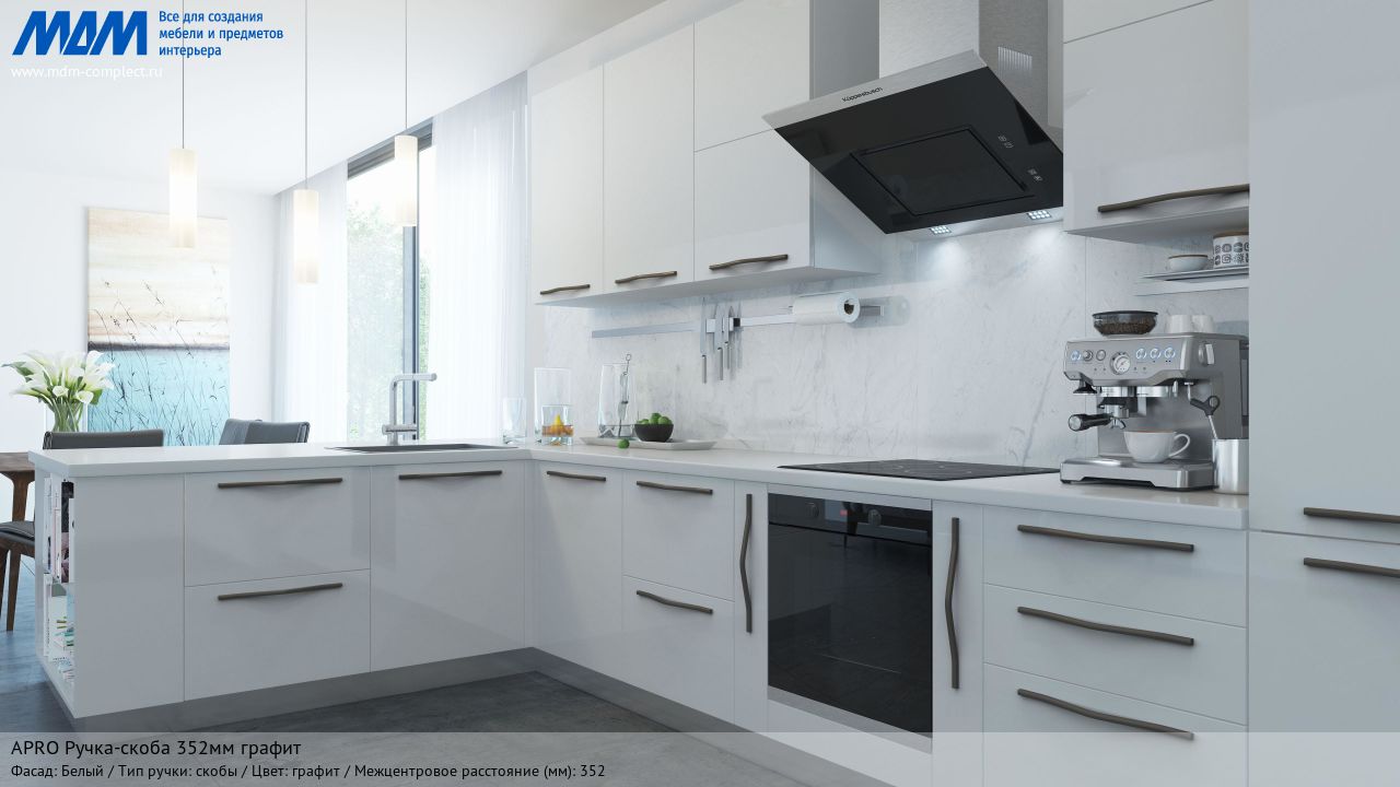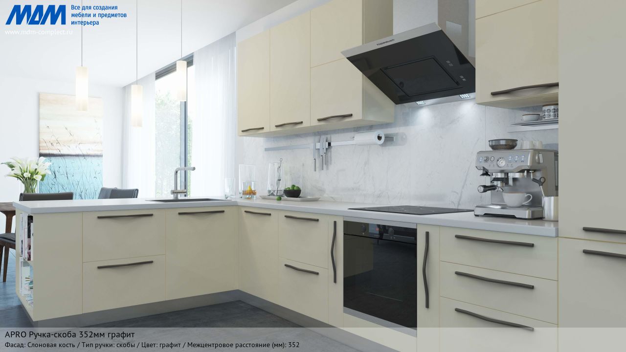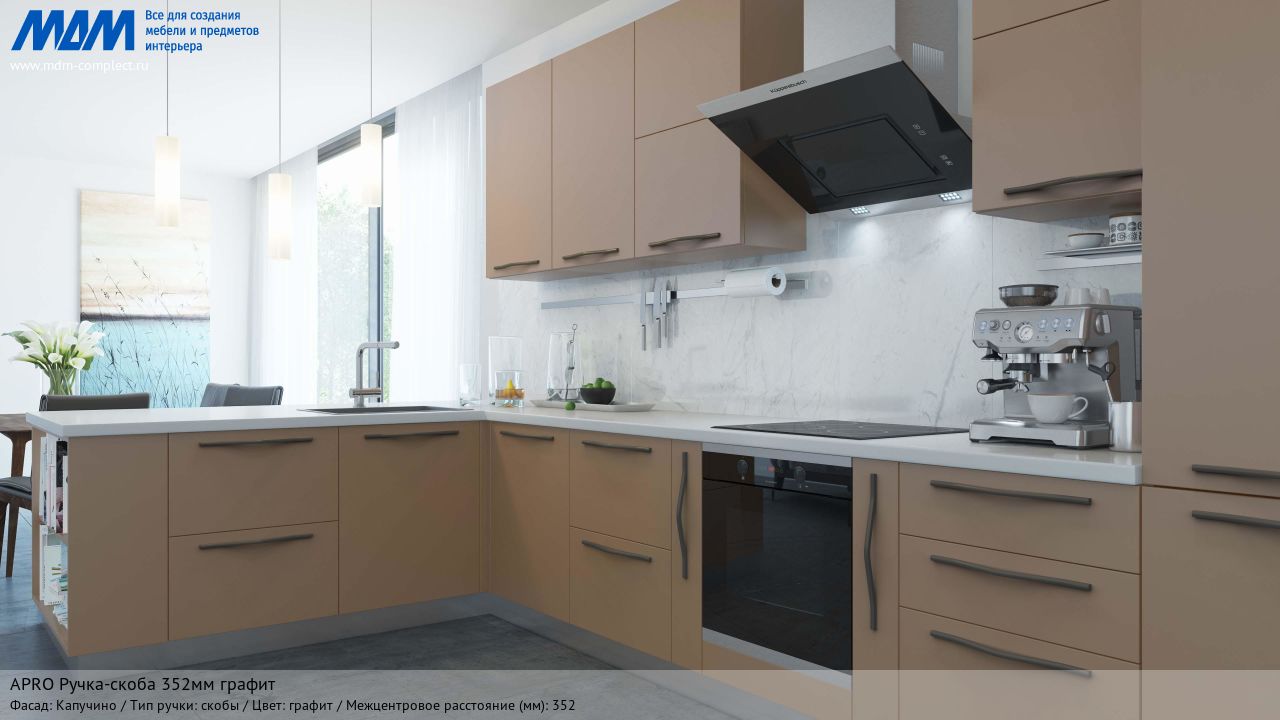 Мебельная apro ручка-скоба 352мм графит на различных фасадах в кухонном интерьере в стиле модерн.
