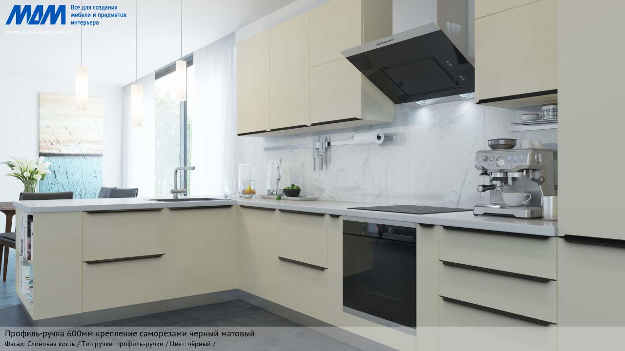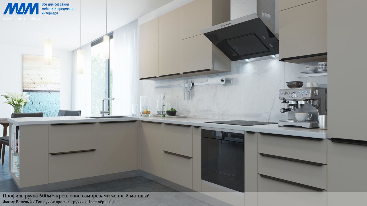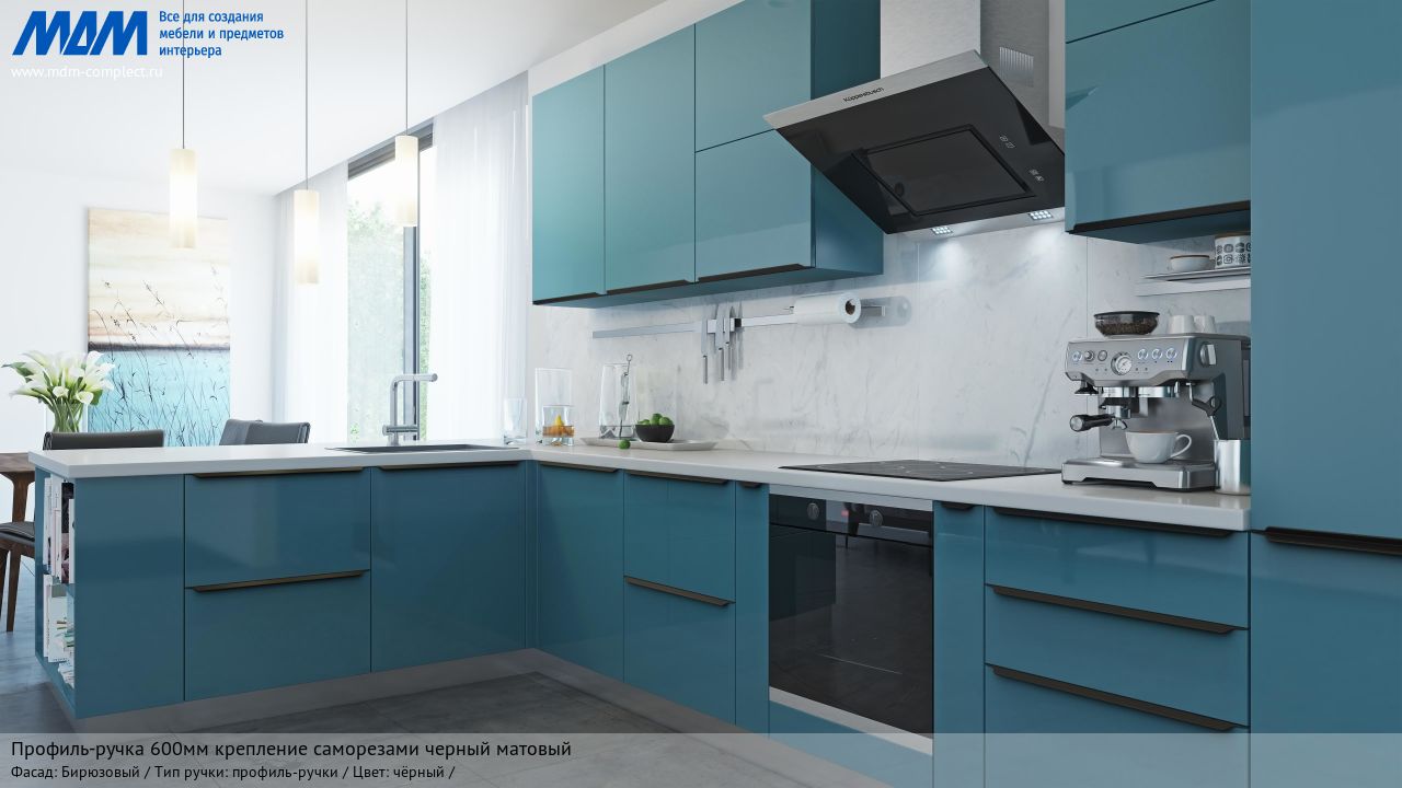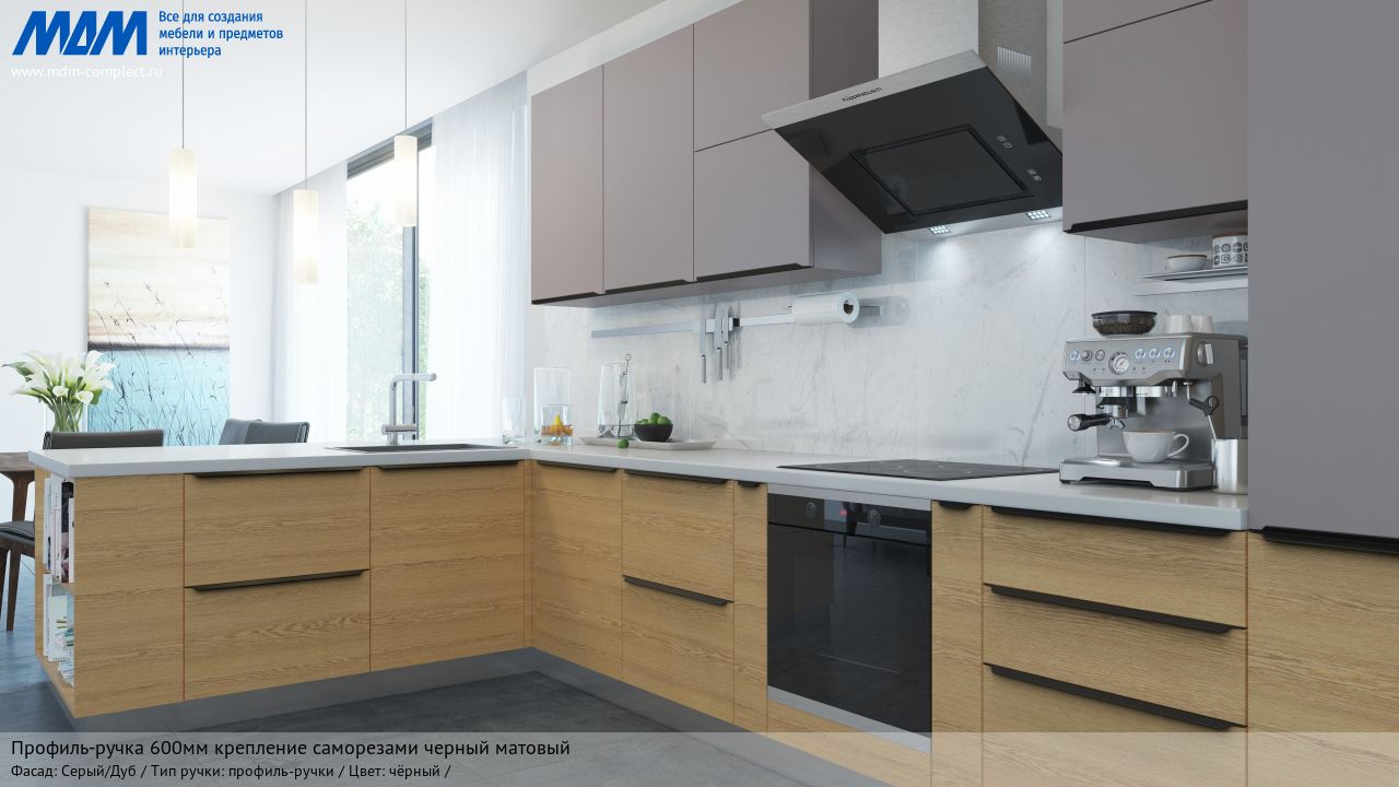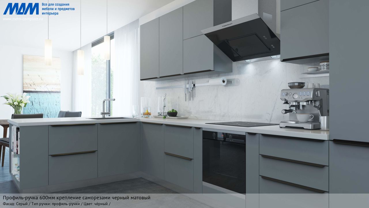 Мебельная профиль-ручка 600мм крепление саморезами черный матовый (анод) на различных фасадах в кухонном интерьере в стиле модерн.