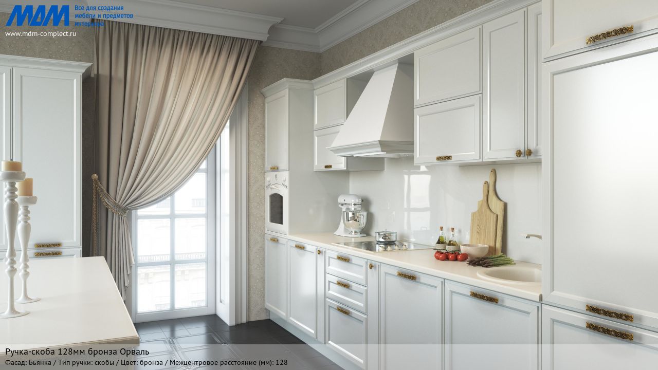 Мебельная ручка-скоба 128мм бронза орваль на различных фасадах в кухонном интерьере в стиле классика.