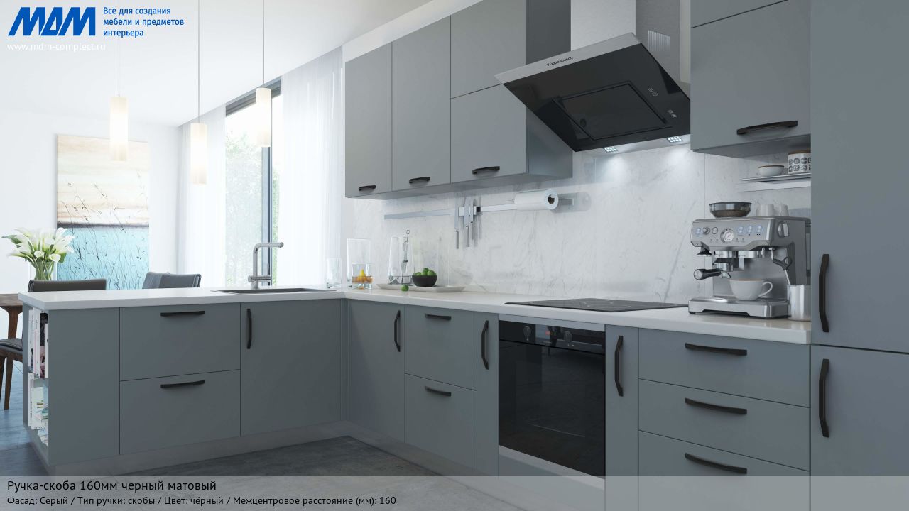 Ручка-скоба 160мм черный матовый (399B.160.52) в готовой кухне на различных фасадах, стиль модерн