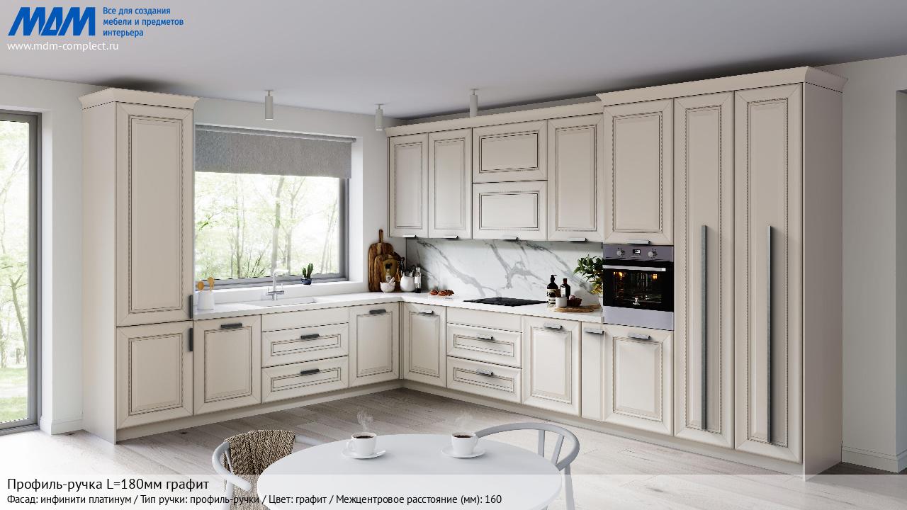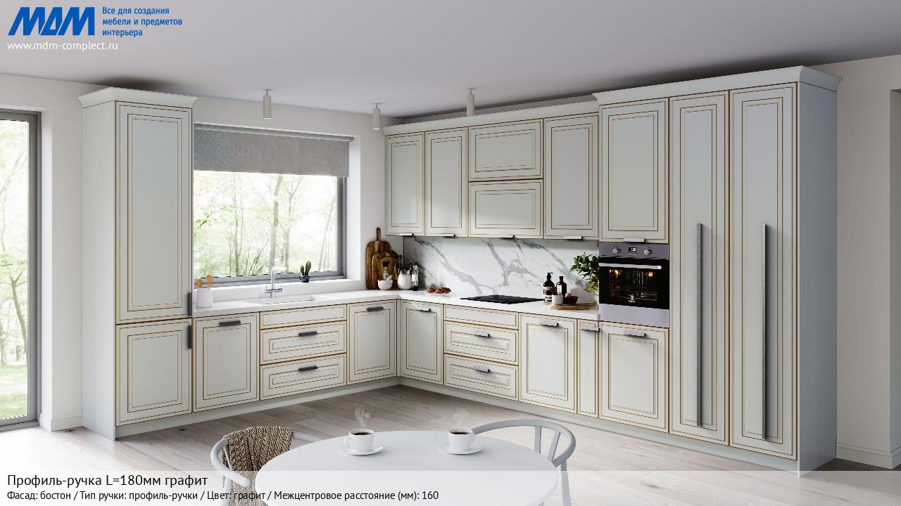 Мебельная Профиль-ручка L=180мм графит на различных фасадах в кухонном интерьере в стиле классика, лофт, модерн.