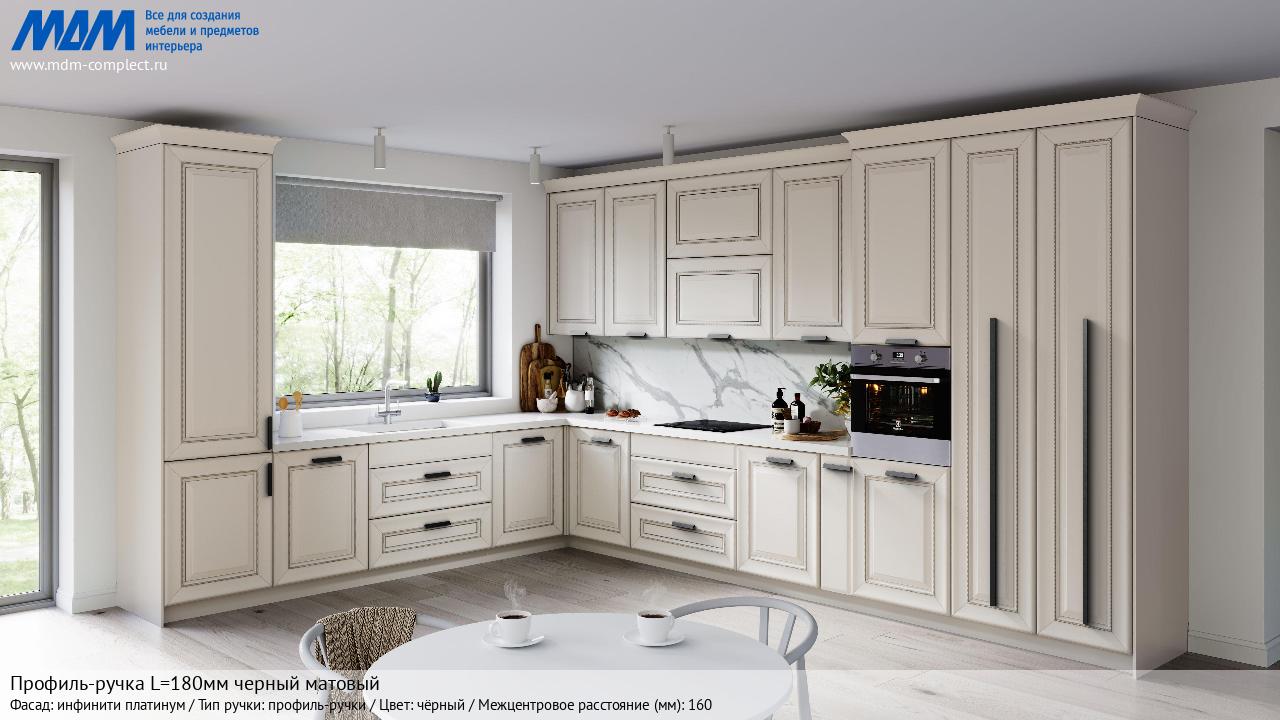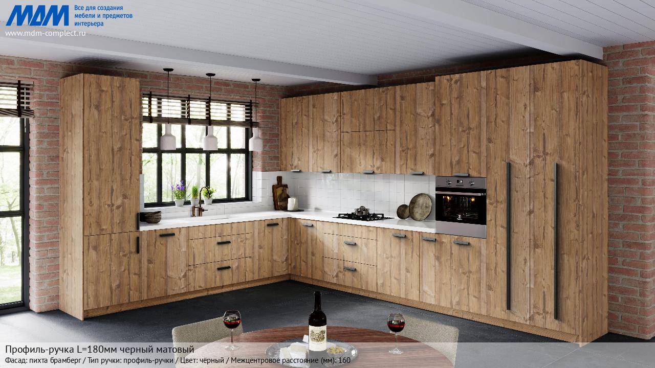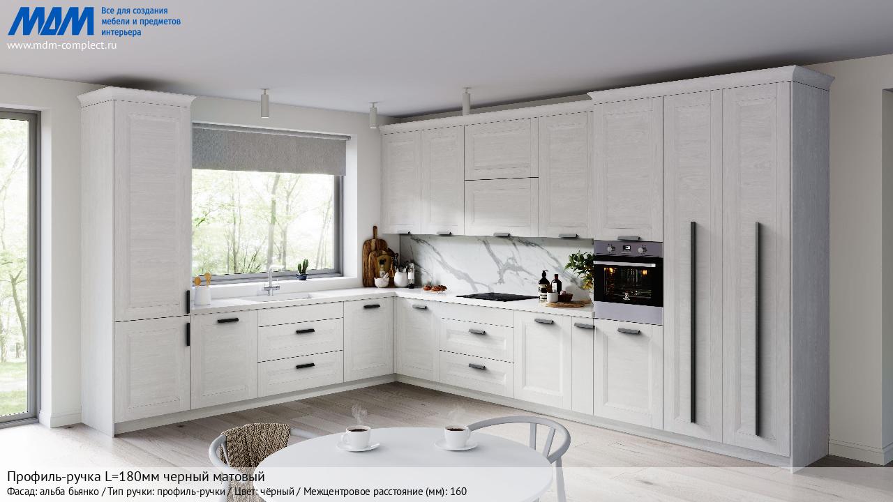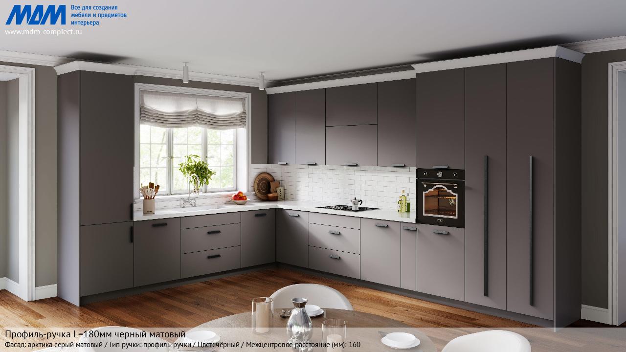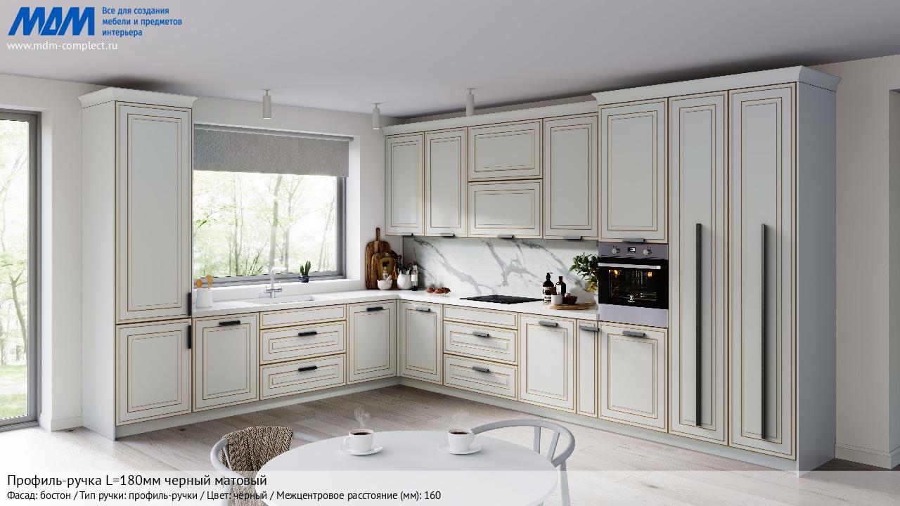 Мебельная Профиль-ручка L=180мм черный матовый на различных фасадах в кухонном интерьере в стиле классика, лофт, модерн.