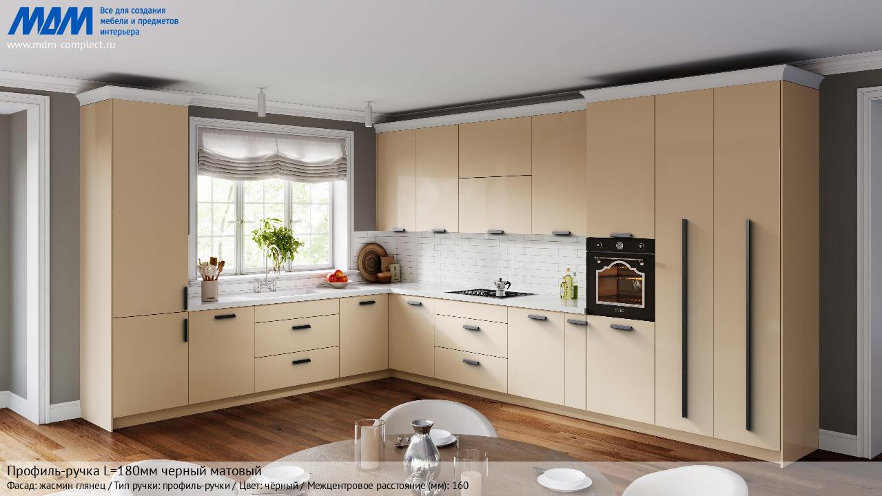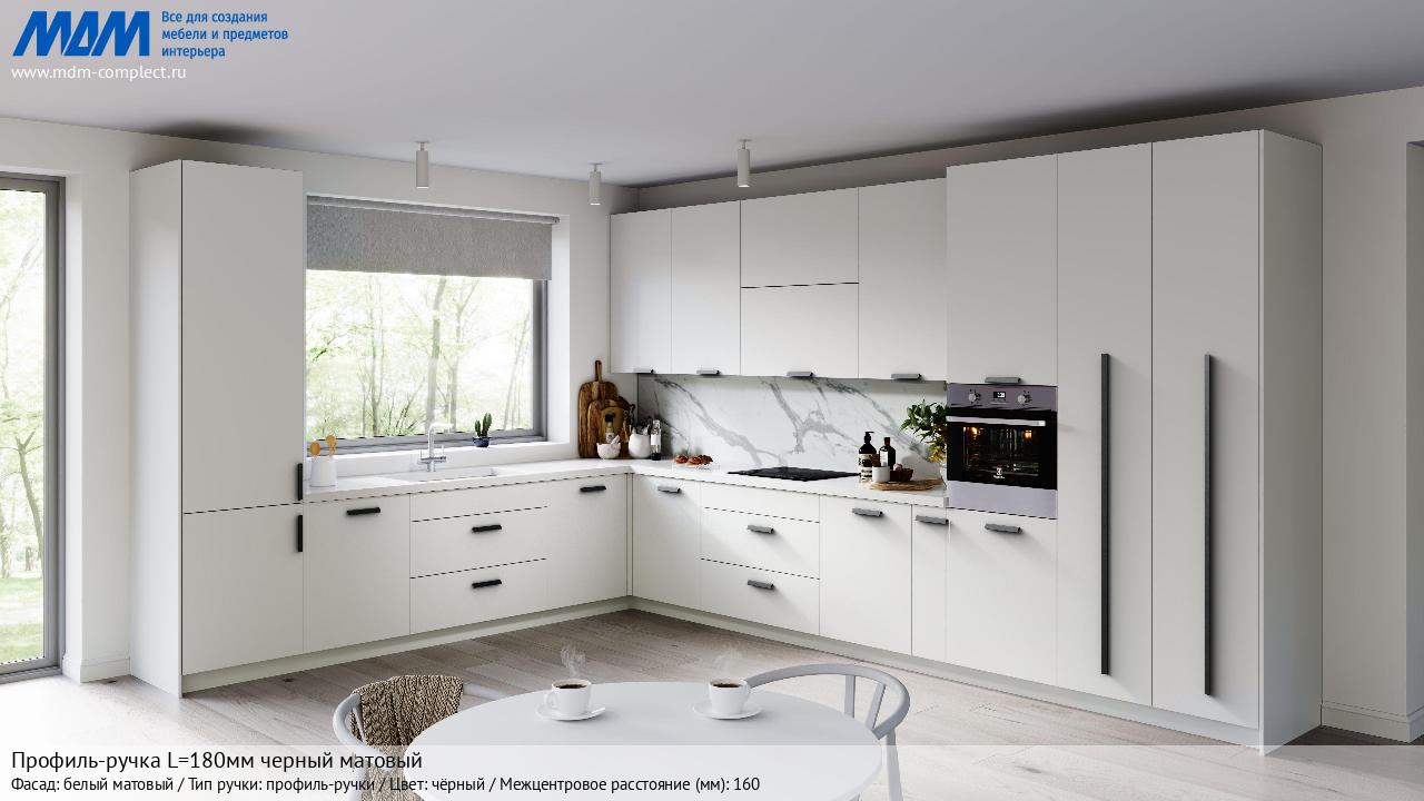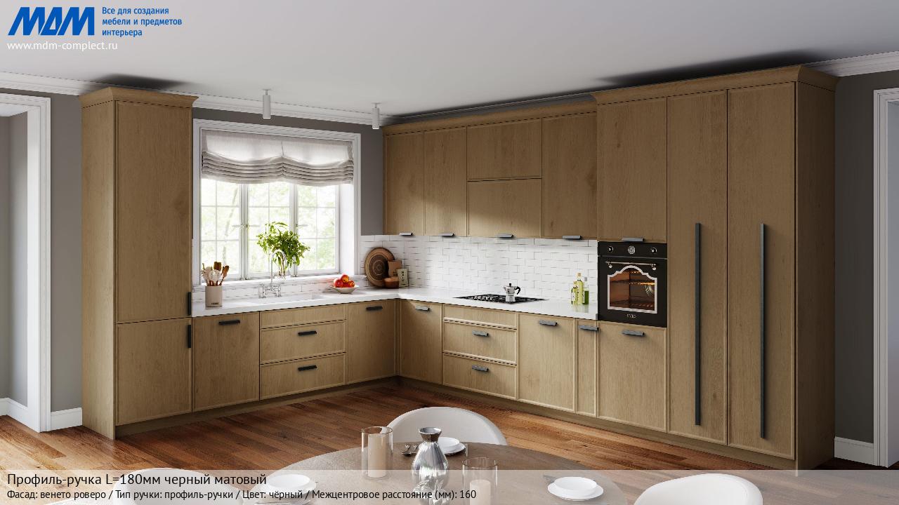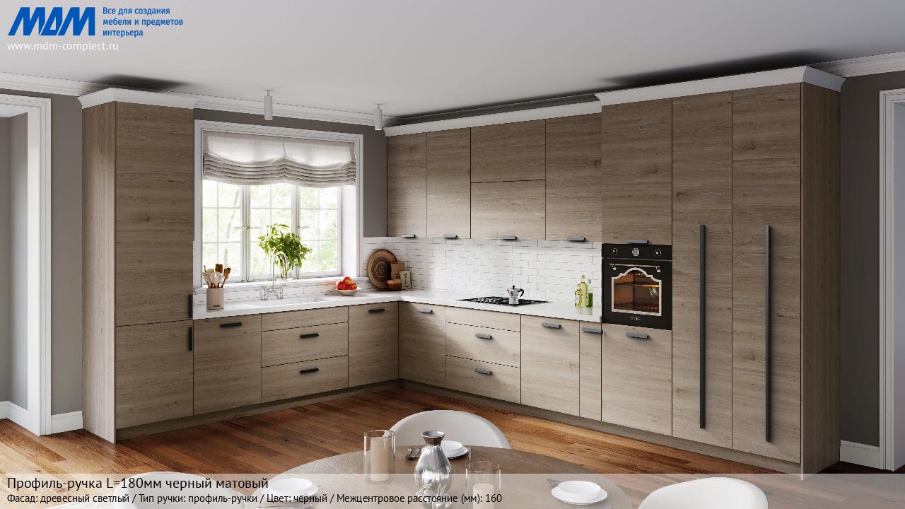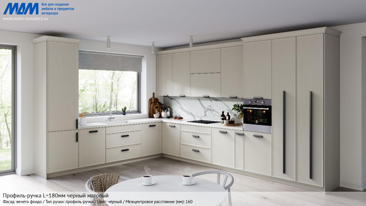 Мебельная Профиль-ручка L=180мм черный матовый на различных фасадах в кухонном интерьере в стиле классика, лофт, модерн.