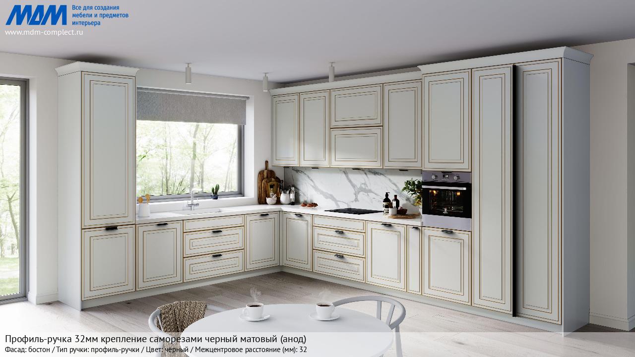 Мебельная Профиль-ручка 32мм (L=60мм) крепление саморезами черный матовый (краска RAL 9005) на различных фасадах в кухонном интерьере в стиле классика, лофт, модерн.