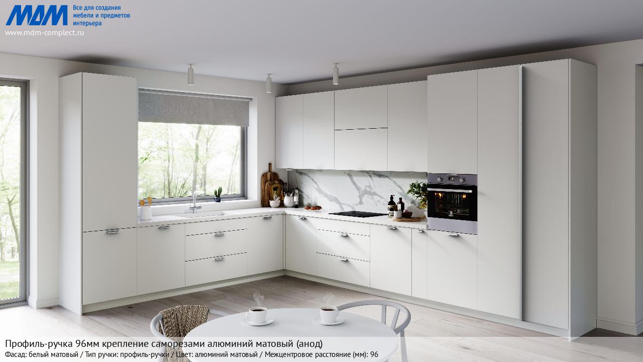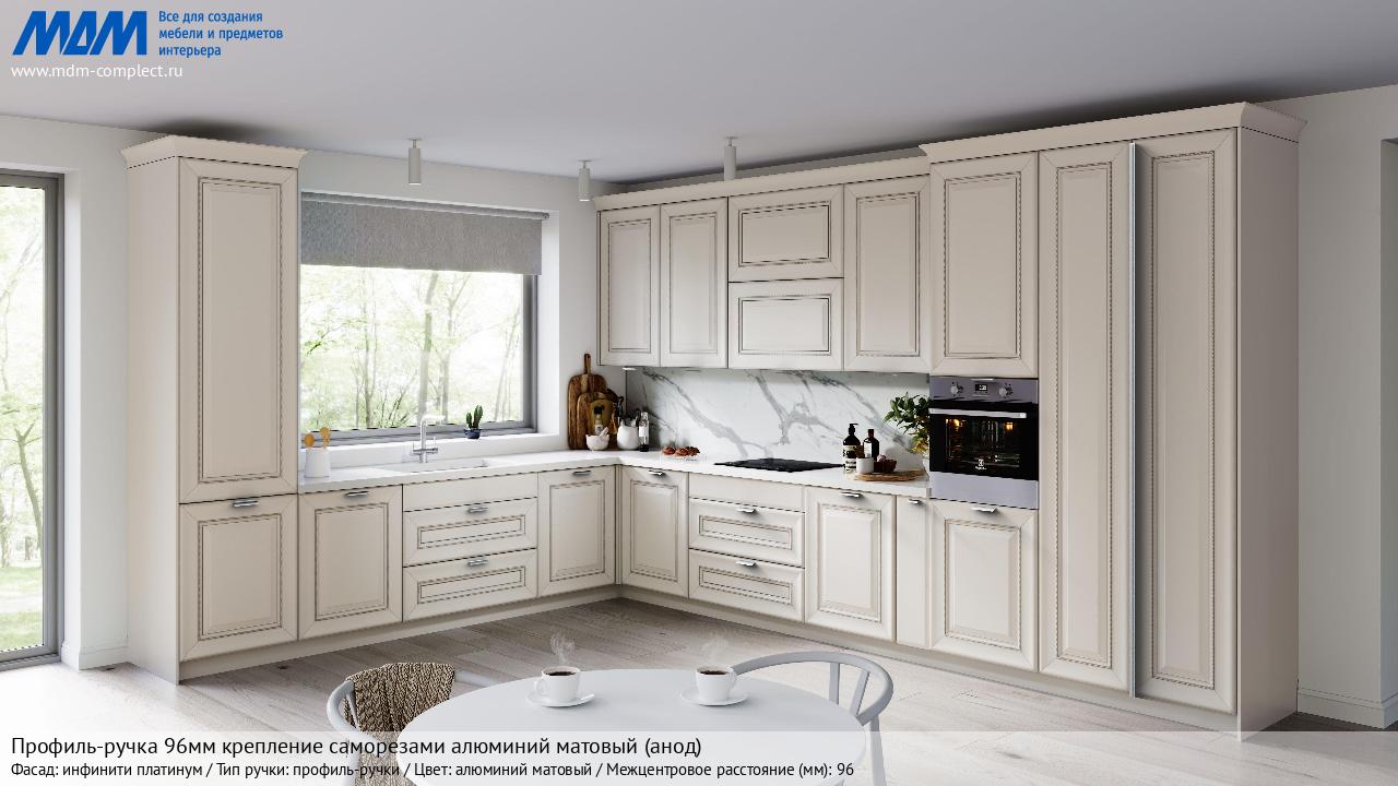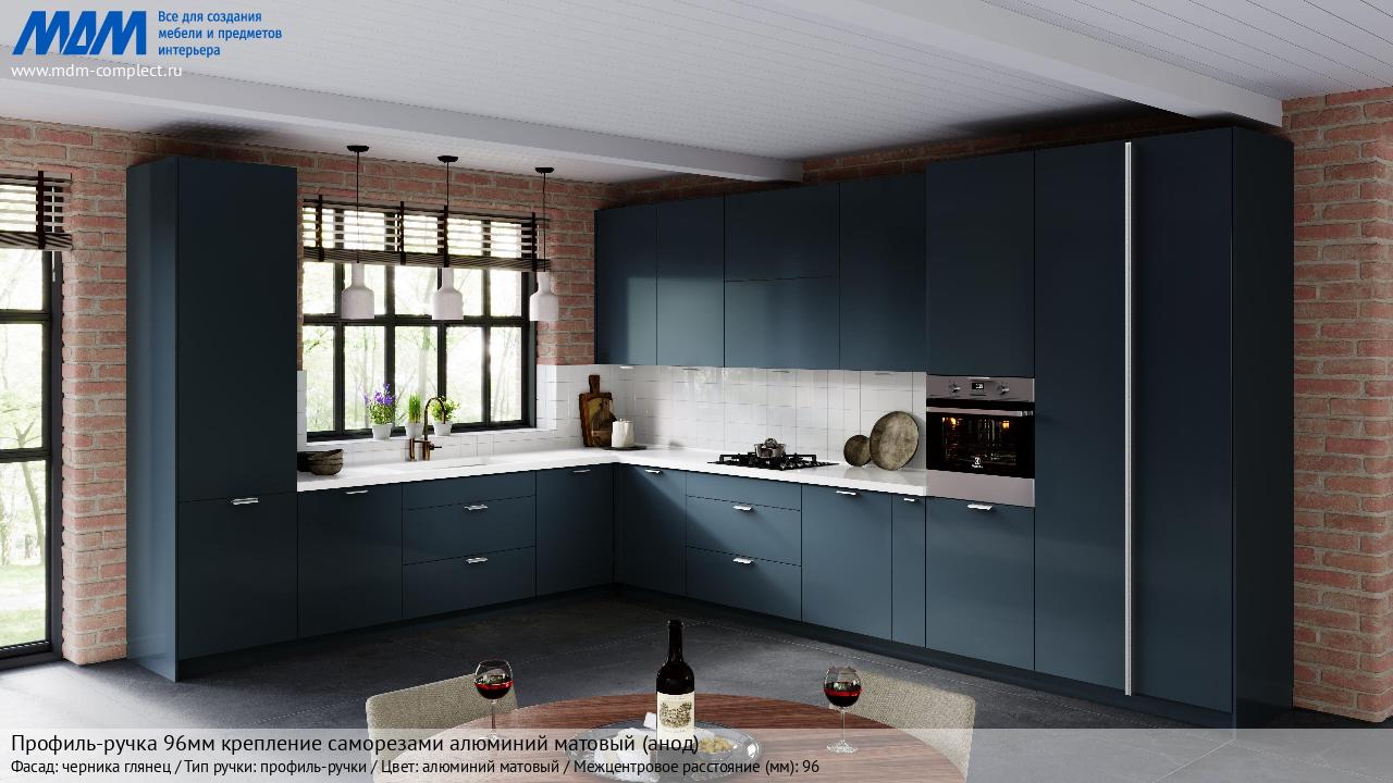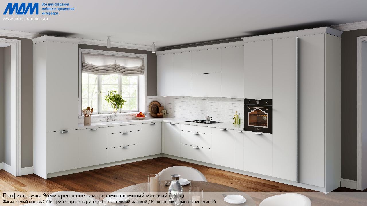 Мебельная Профиль-ручка 96мм (L=124мм) крепление саморезами алюминий матовый (анод) на различных фасадах в кухонном интерьере в стиле классика, лофт, модерн.