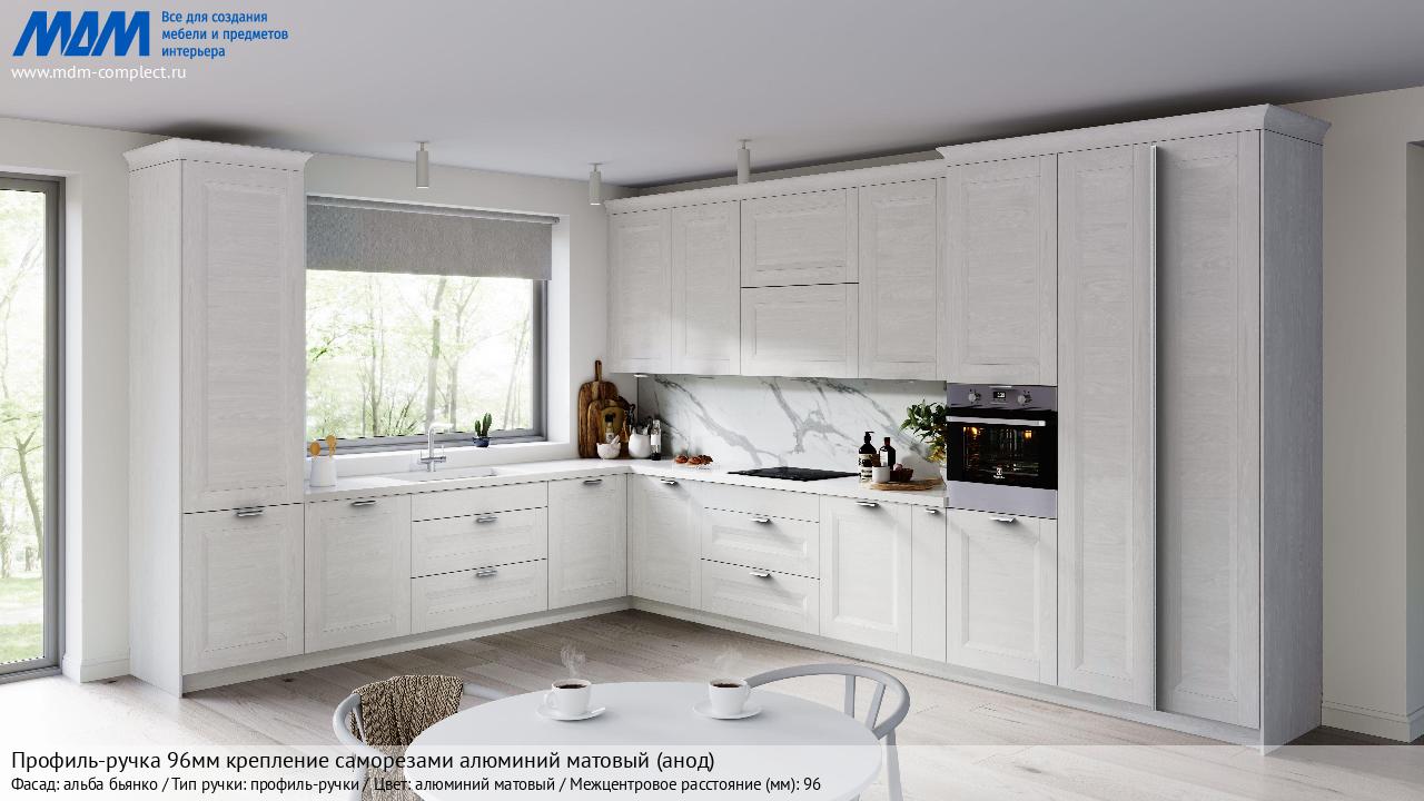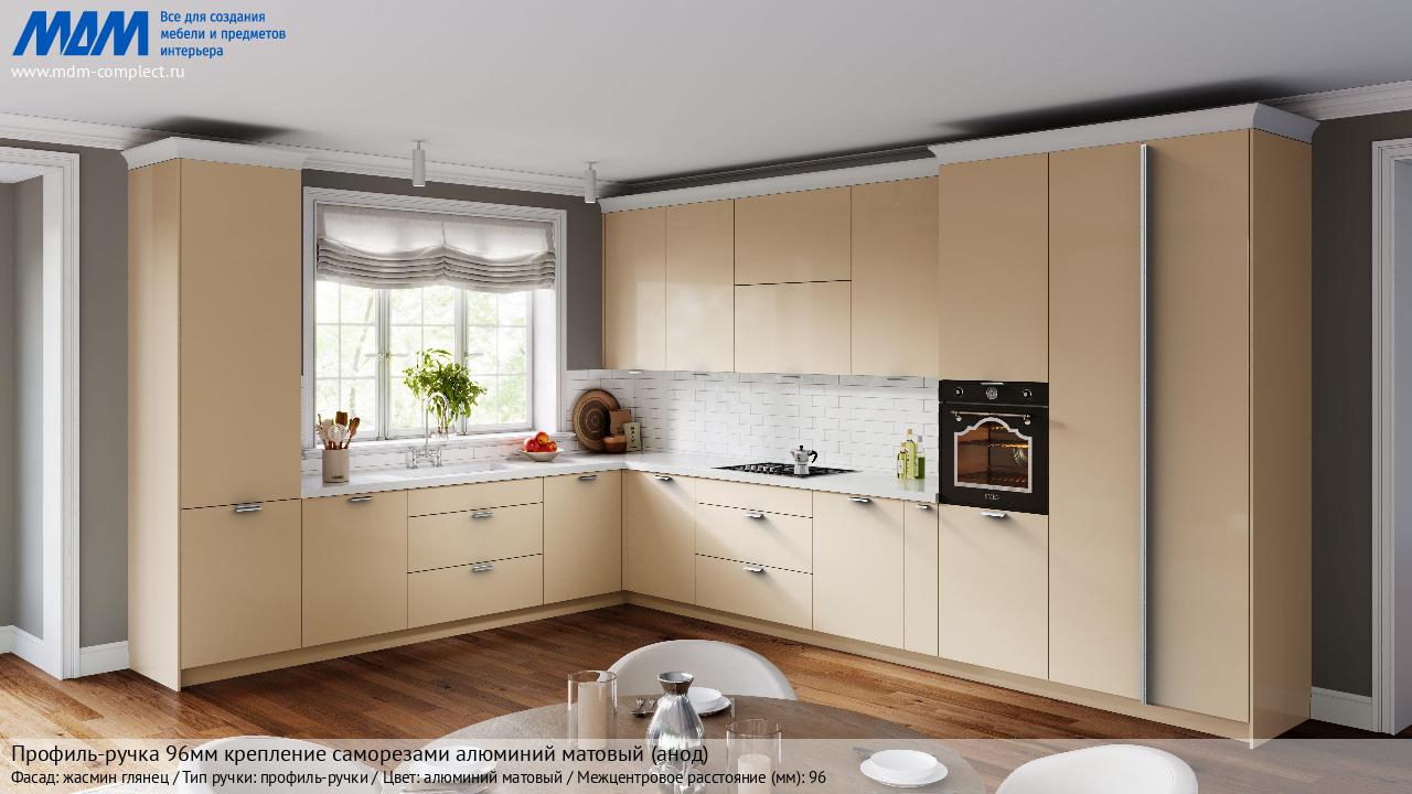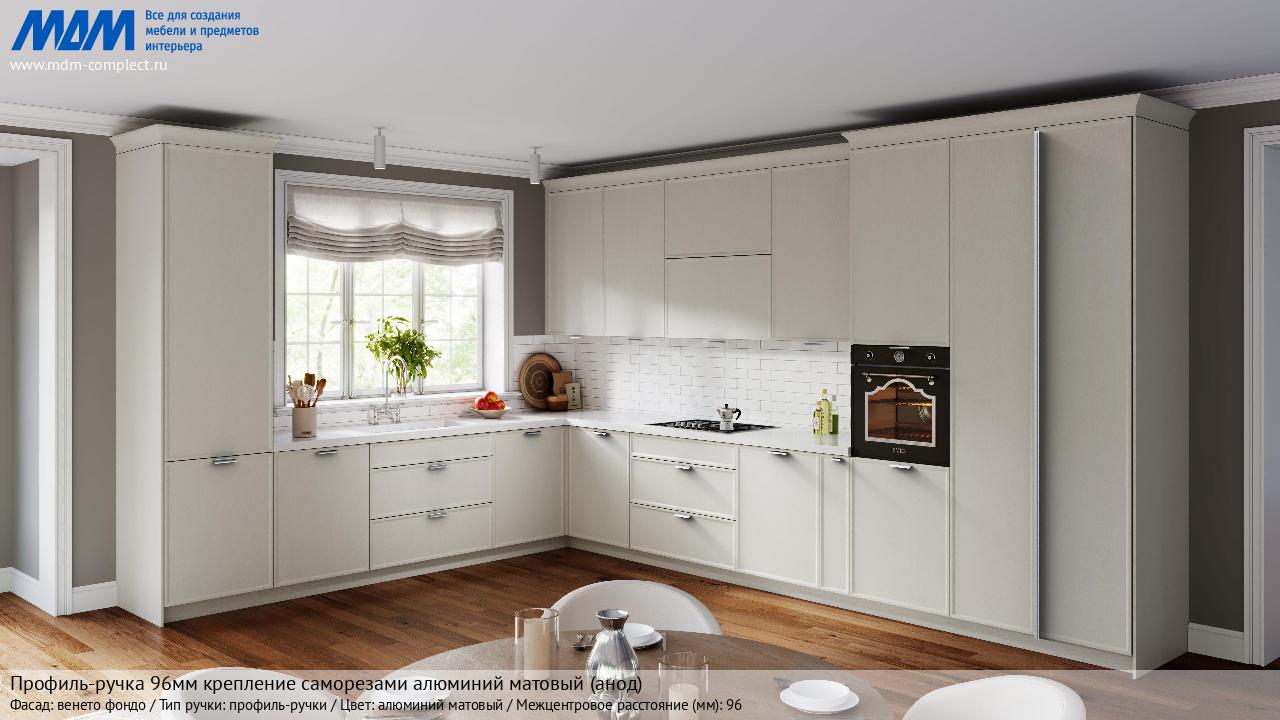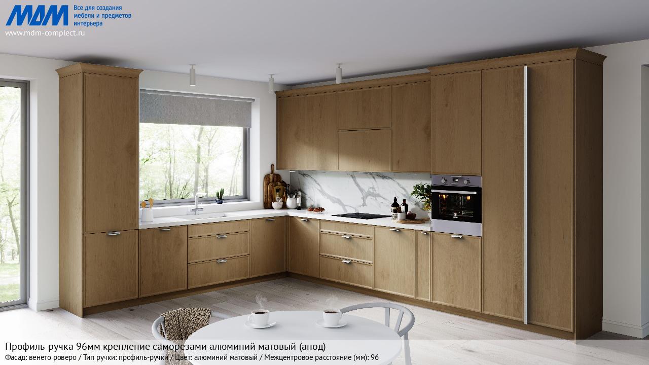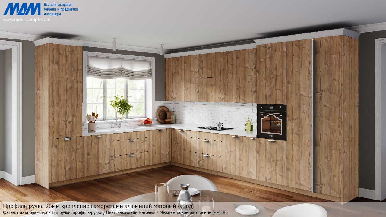Мебельная Профиль-ручка 96мм (L=124мм) крепление саморезами алюминий матовый (анод) на различных фасадах в кухонном интерьере в стиле классика, лофт, модерн.