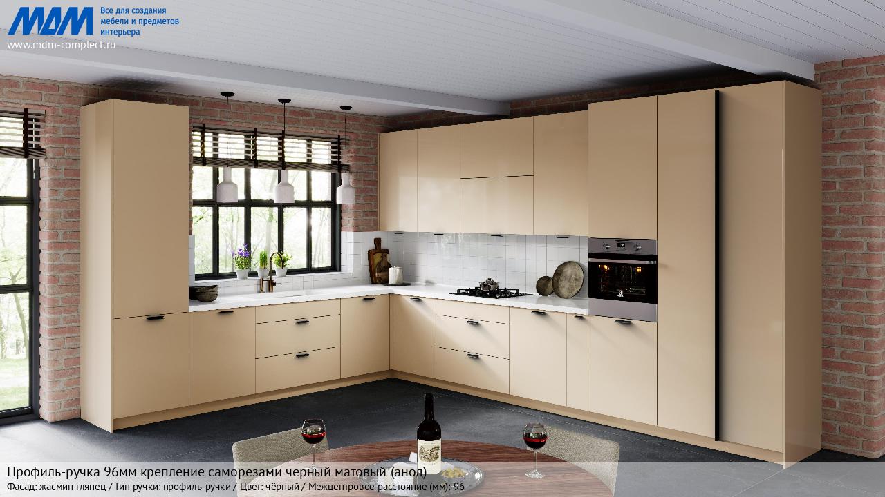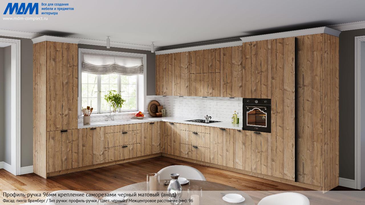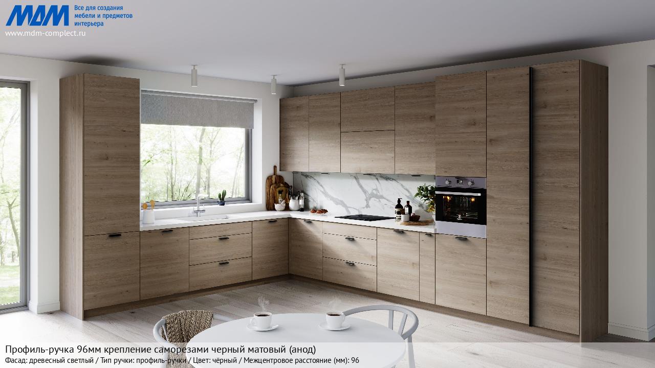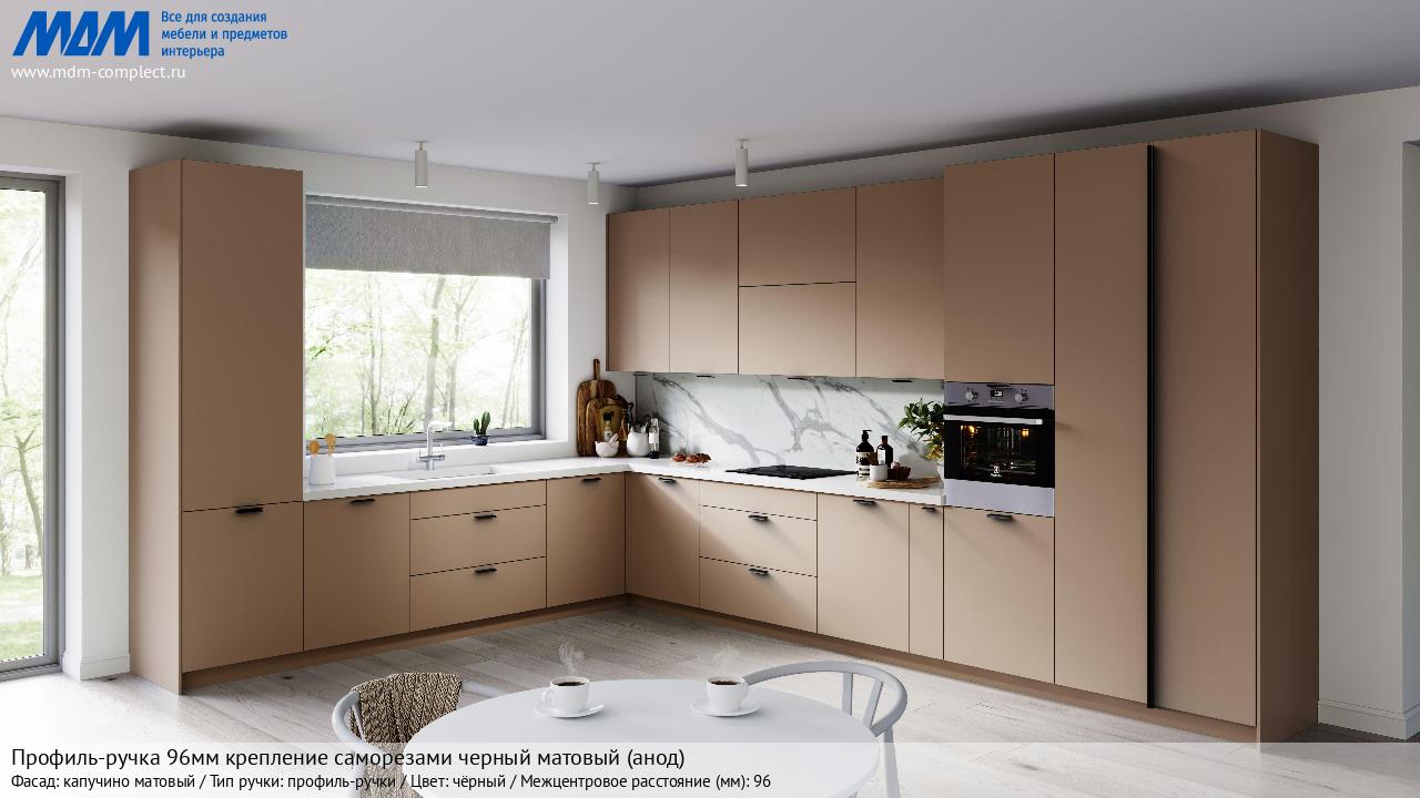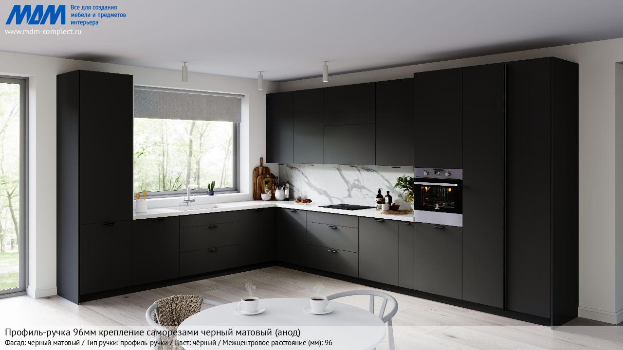 Профиль-ручка 96мм (L=124мм) крепление саморезами черный матовый (краска RAL 9005) (PH.RU15.096.BL) в готовой кухне на различных фасадах