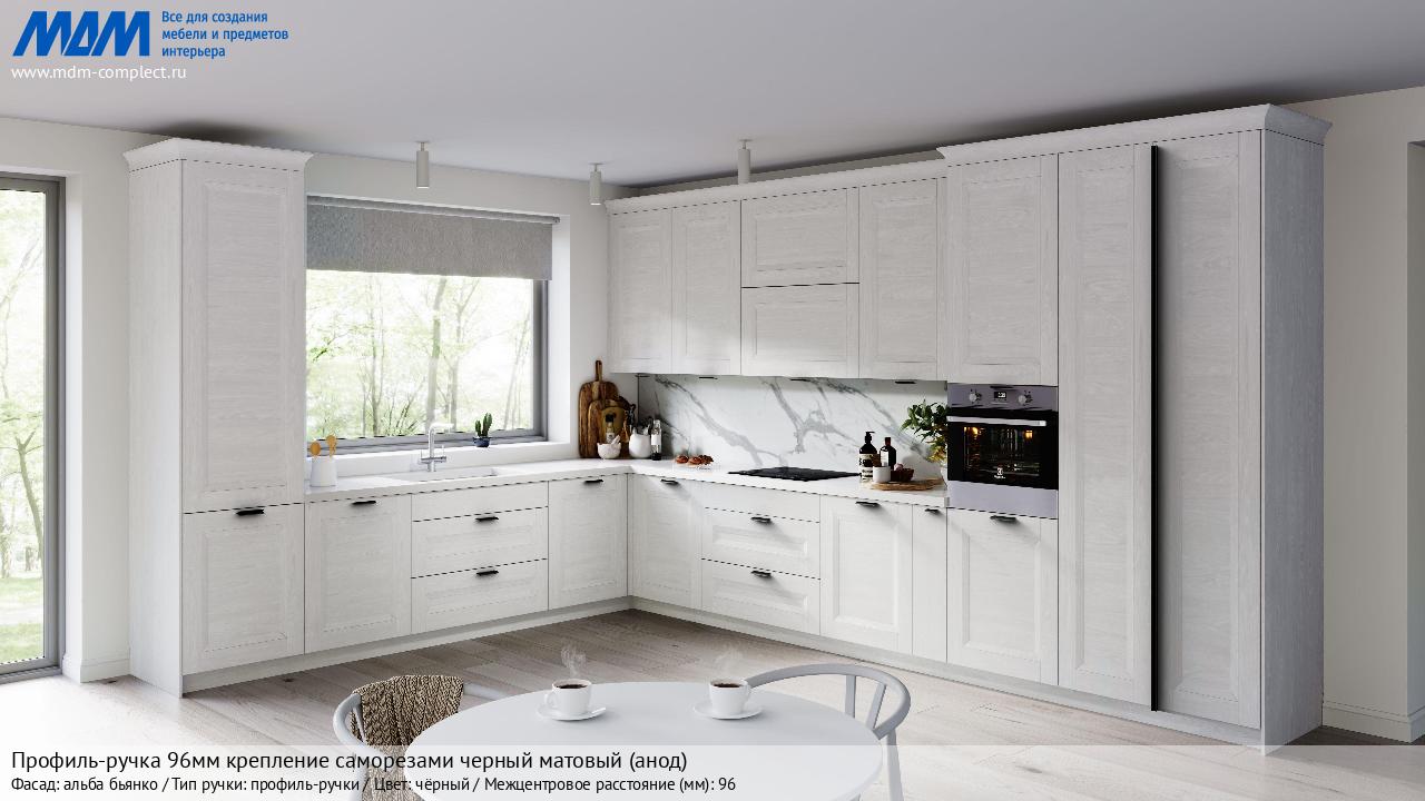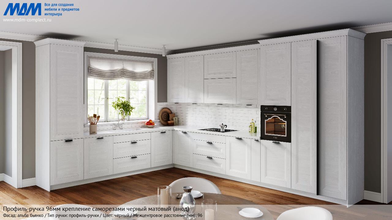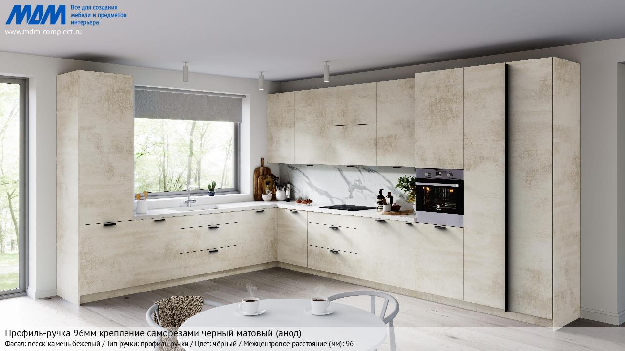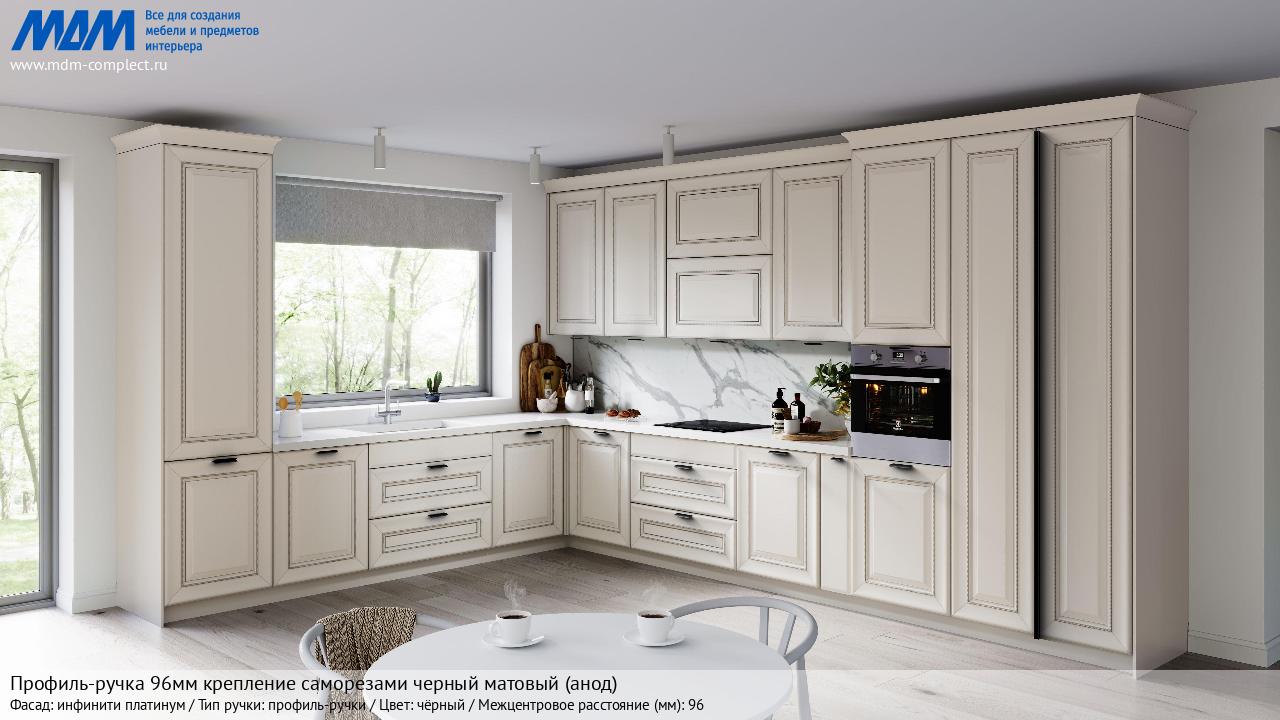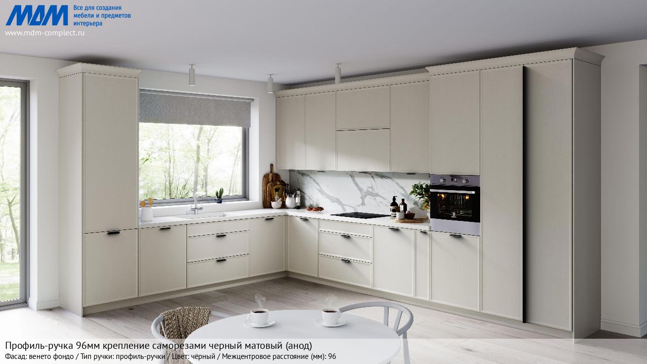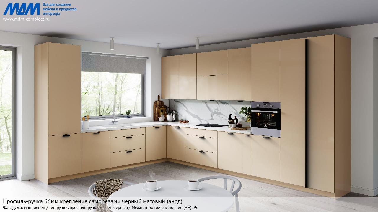 Профиль-ручка 96мм (L=124мм) крепление саморезами черный матовый (краска RAL 9005) (PH.RU15.096.BL) в готовой кухне на различных фасадах