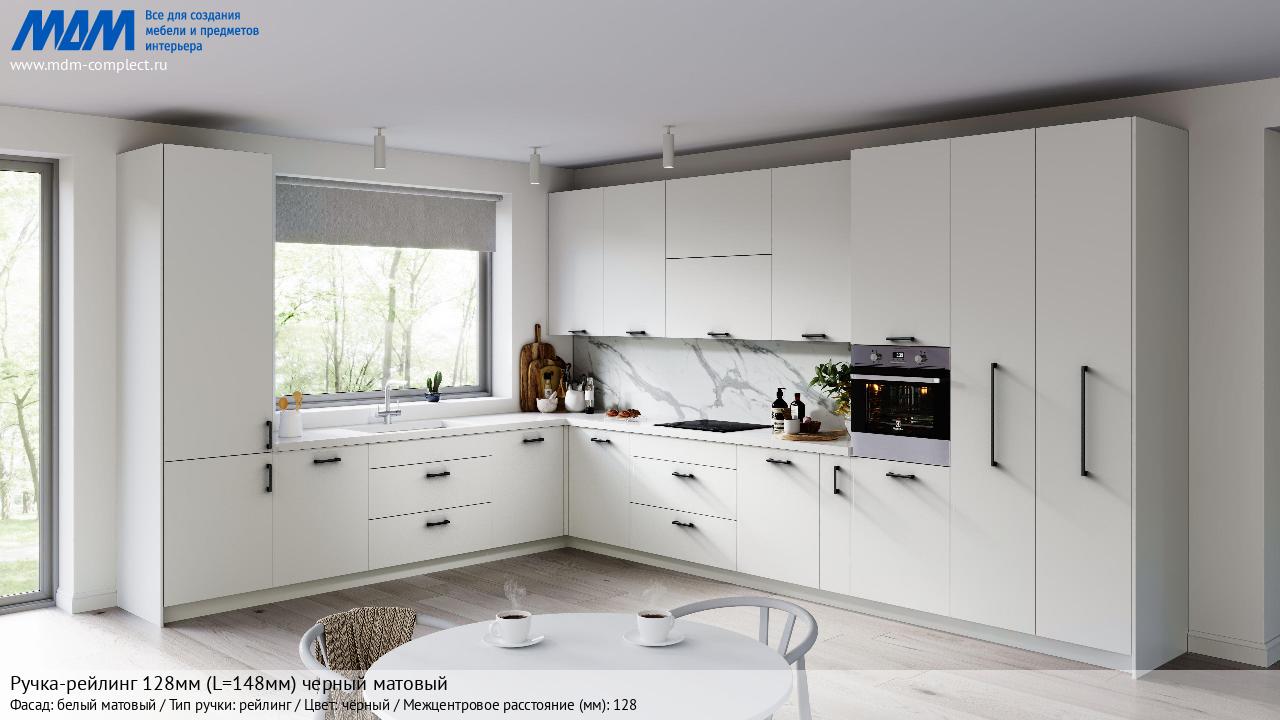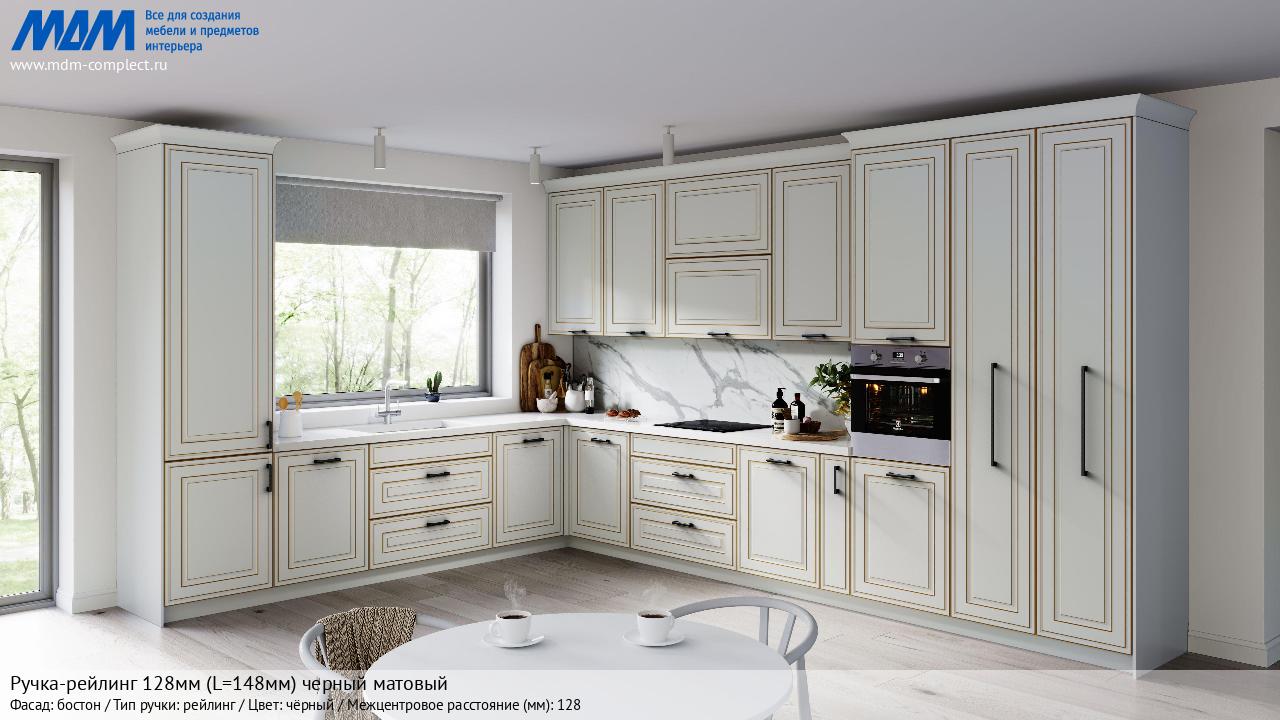 Мебельная Ручка-рейлинг 128мм (L=148мм) черный матовый на различных фасадах в кухонном интерьере в стиле классика, лофт, модерн.
