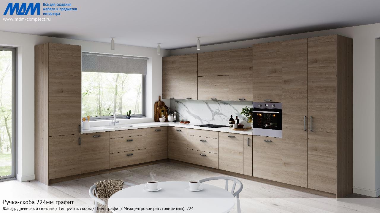 Характеристики ручки: Тип ручки: скобы / Вставка: без вставки / Цвет: графит / Межцентровое расстояние (мм): 224