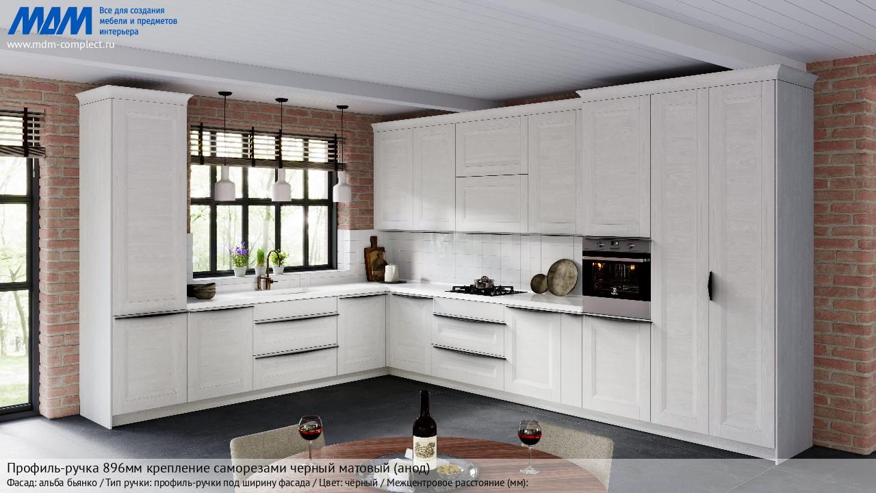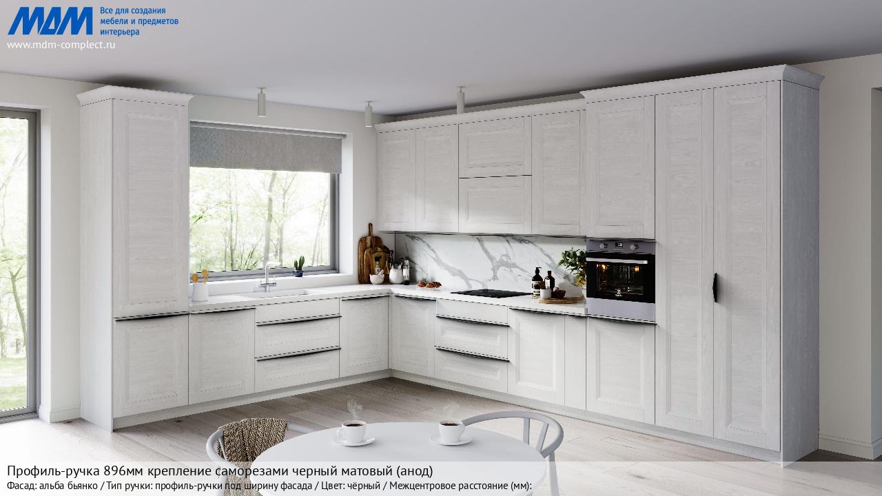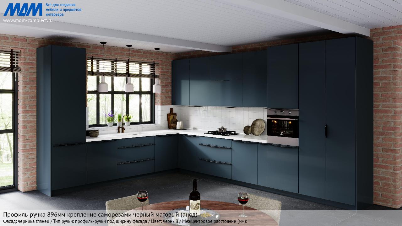 Мебельная Профиль-ручка L=896мм крепление саморезами черный матовый (краска RAL 9005) на различных фасадах в кухонном интерьере в стиле классика, лофт, модерн.