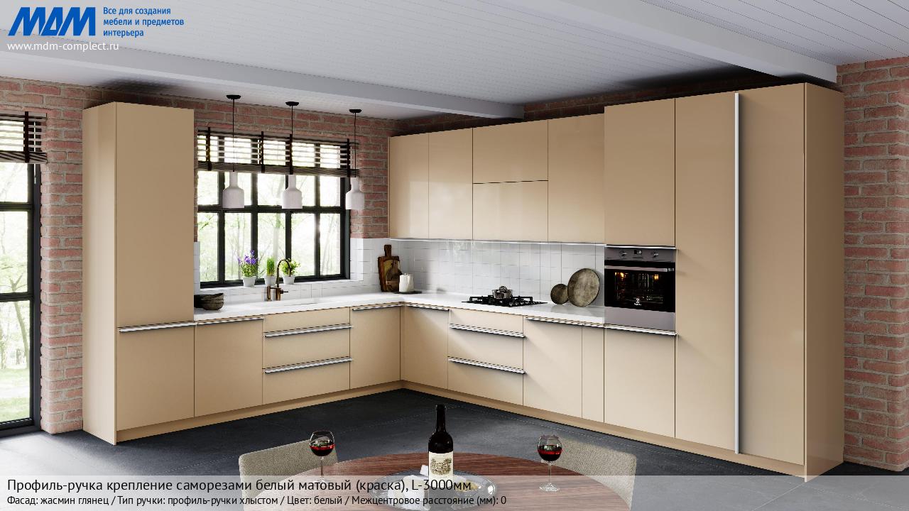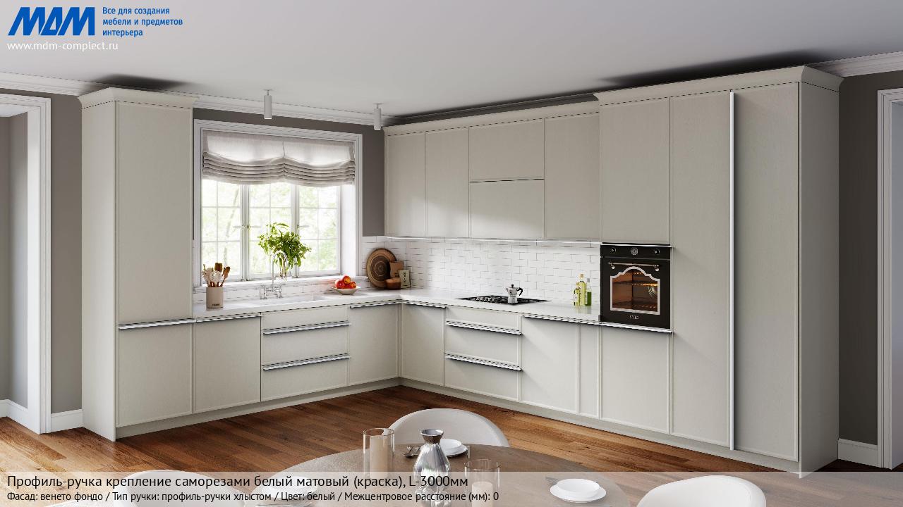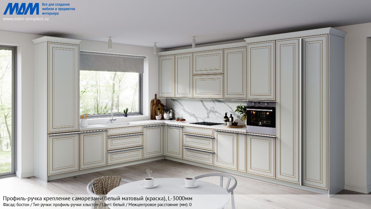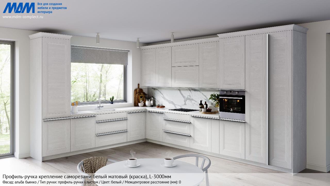Мебельная Профиль-ручка крепление саморезами белый матовый (краска RAL9016), L-3000мм на различных фасадах в кухонном интерьере в стиле классика, лофт, модерн.