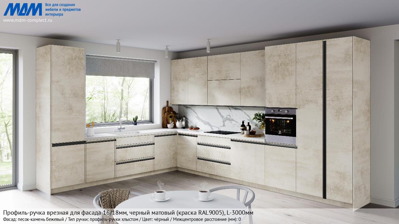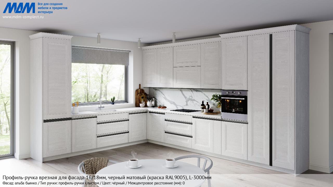 Мебельная Профиль-ручка врезная для фасада 16/18мм, черный матовый (краска RAL9005), L-3000мм на различных фасадах в кухонном интерьере в стиле классика, лофт, модерн.
