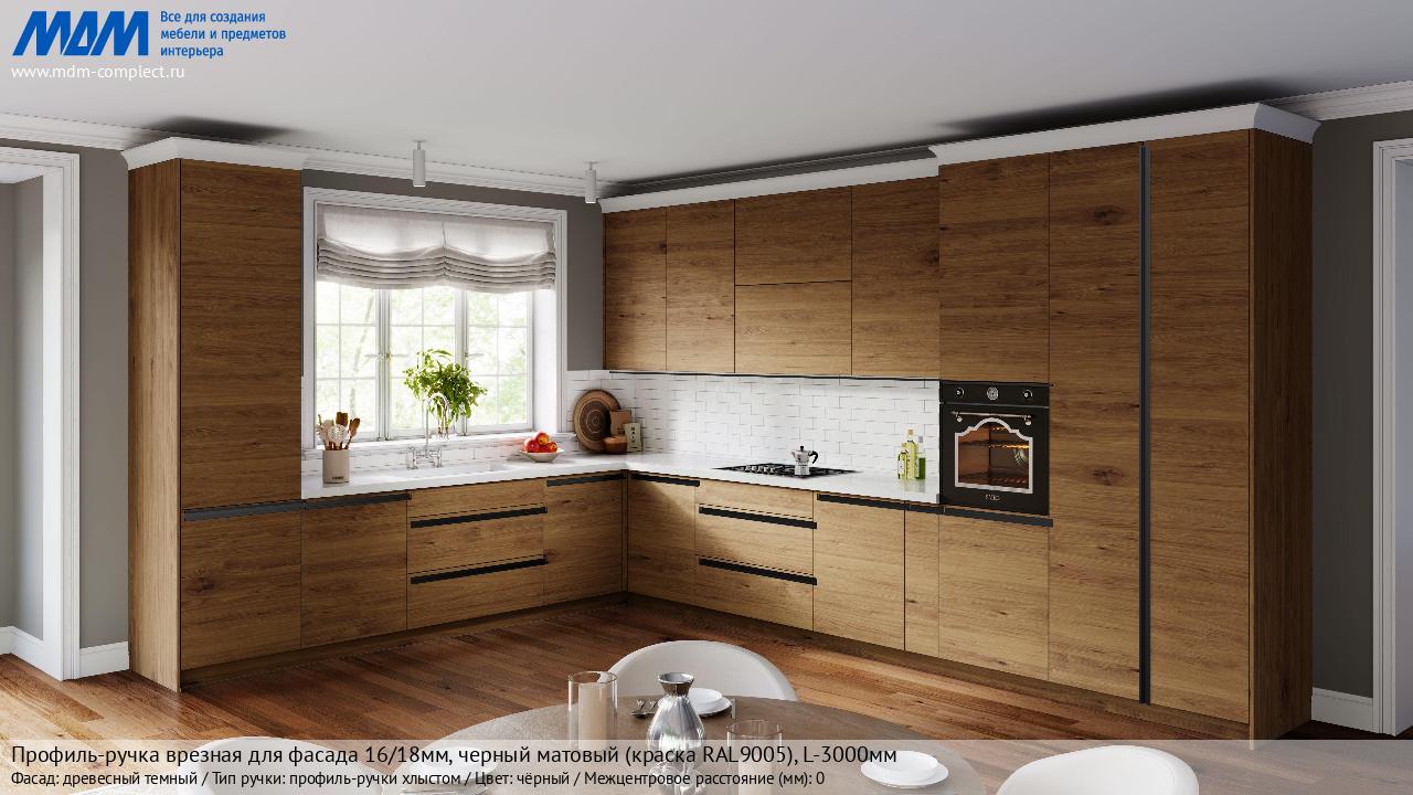 Мебельная Профиль-ручка врезная для фасада 16/18мм, черный матовый (краска RAL9005), L-3000мм на различных фасадах в кухонном интерьере в стиле классика, лофт, модерн.