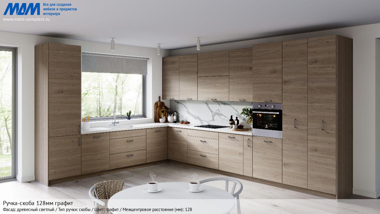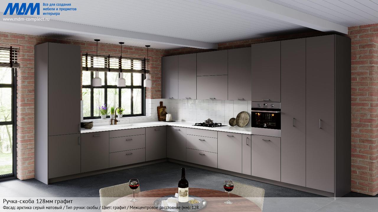 Мебельная Ручка-скоба 128мм графит на различных фасадах в кухонном интерьере в стиле классика, лофт, модерн.
