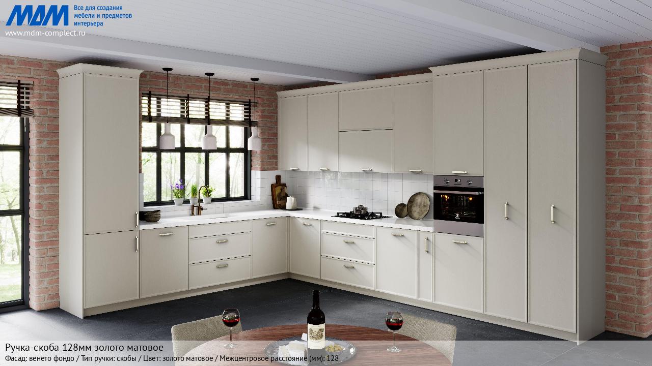 Мебельная Ручка-скоба 128мм золото матовое на различных фасадах в кухонном интерьере в стиле классика, лофт, модерн.