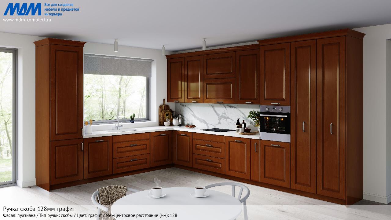 Ручка-скоба 128мм графит (BH.10.128.GF) в готовой кухне на различных фасадах