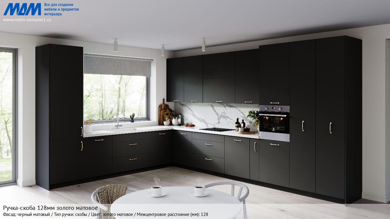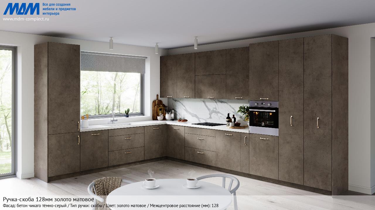 Мебельная Ручка-скоба 128мм золото матовое на различных фасадах в кухонном интерьере в стиле классика, лофт, модерн.