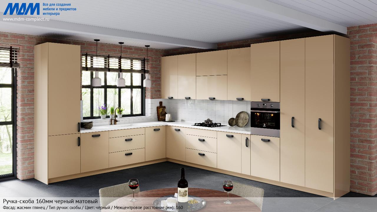 Мебельная Ручка-скоба 160мм черный матовый на различных фасадах в кухонном интерьере в стиле классика, лофт, модерн.