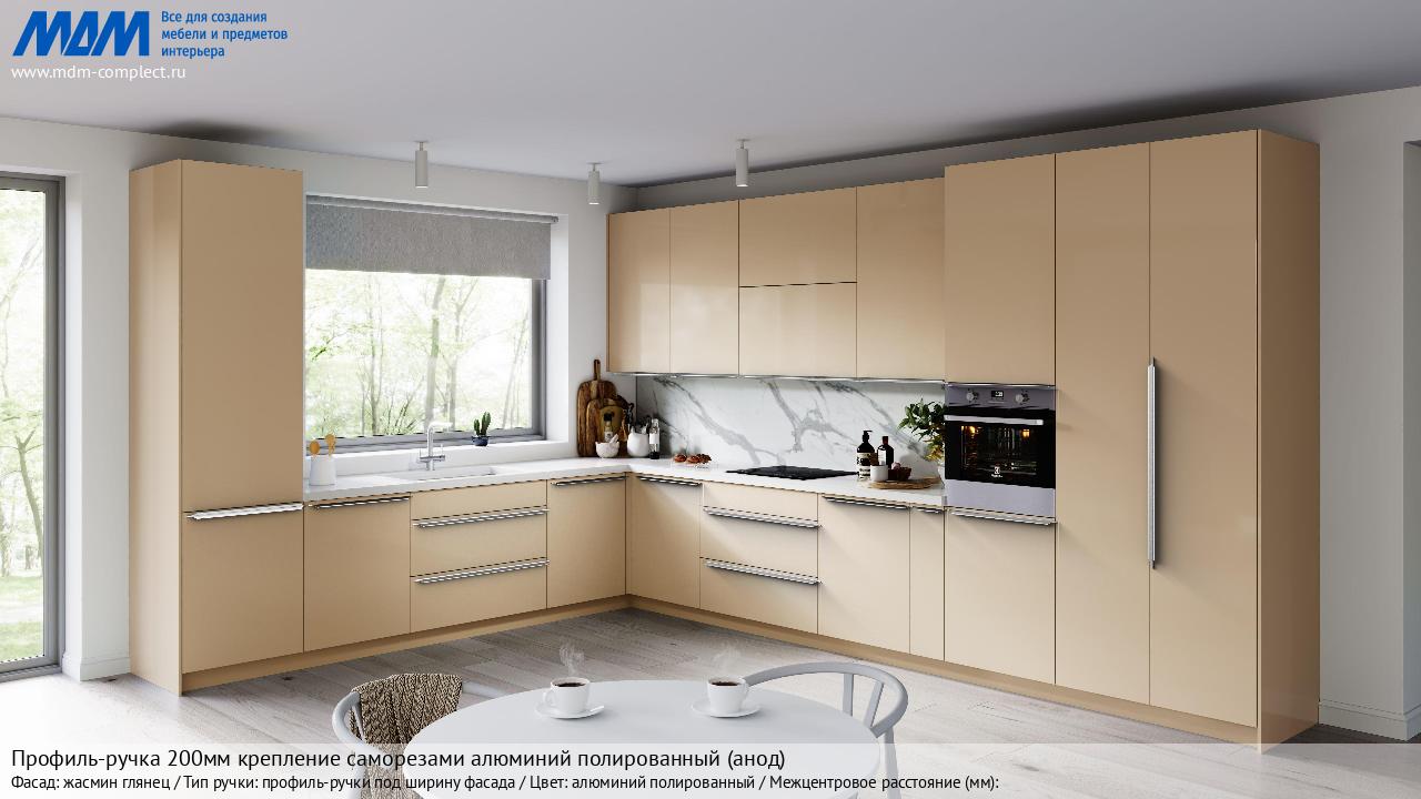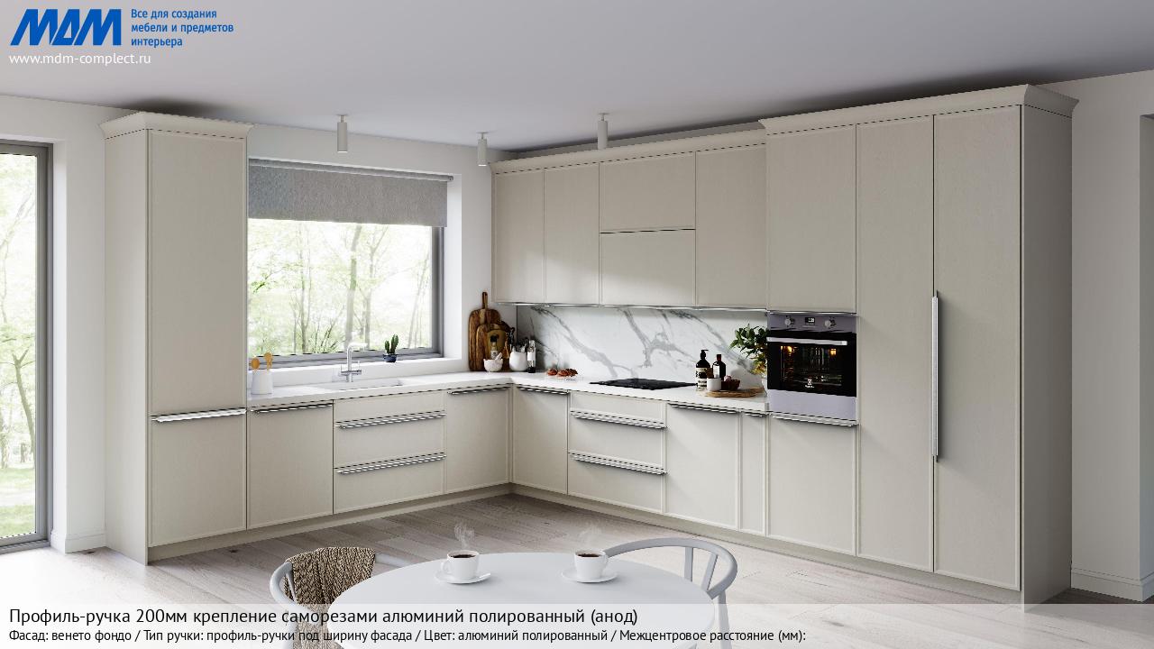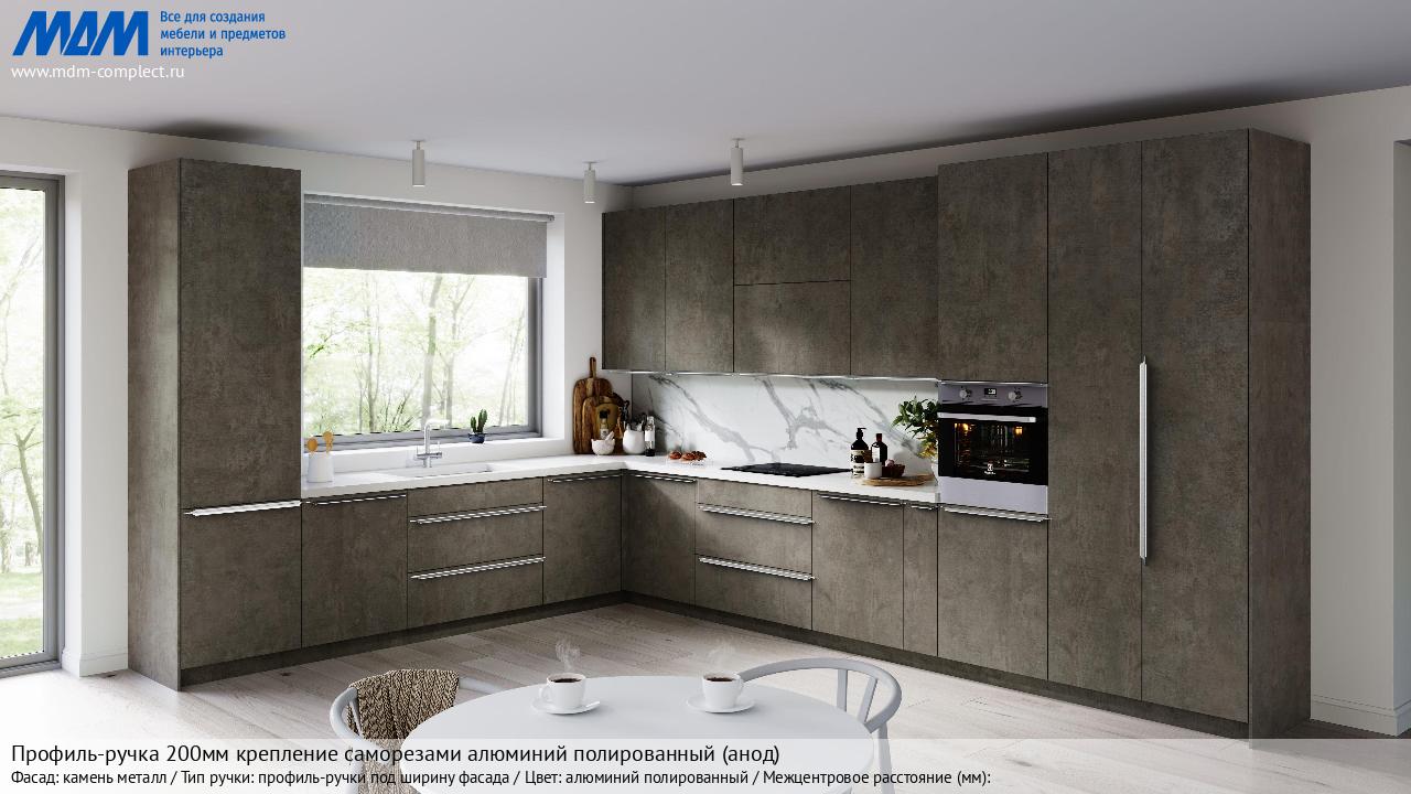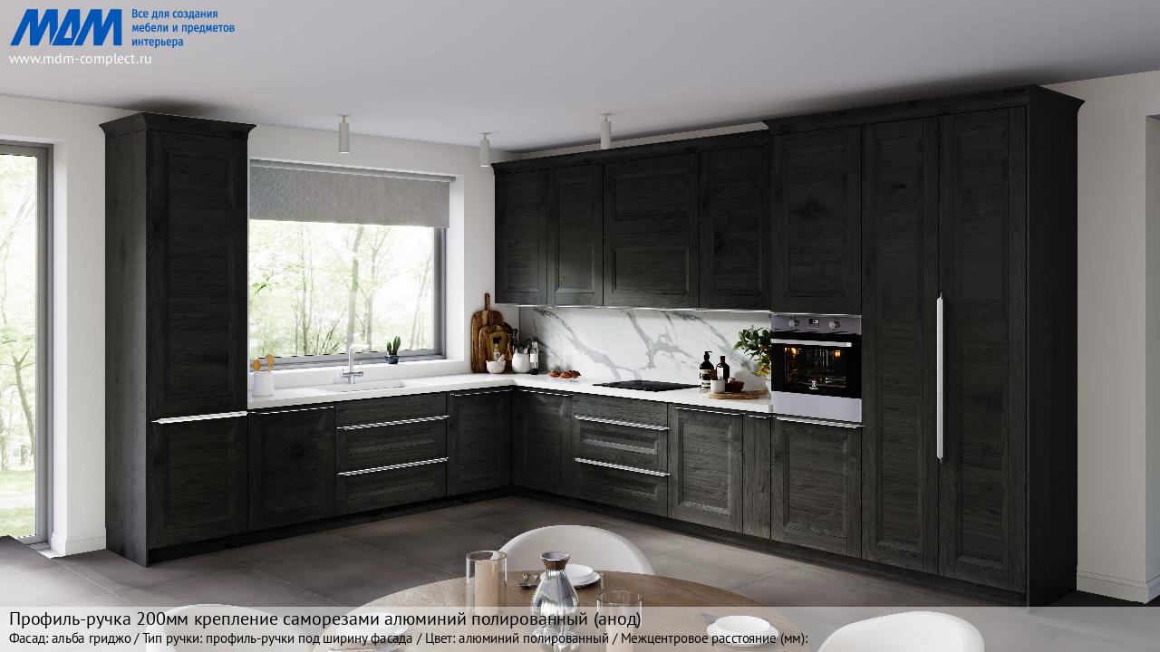 Мебельная Профиль-ручка 200мм крепление саморезами алюминий полированный (анод) на различных фасадах в кухонном интерьере в стиле классика, лофт, модерн.