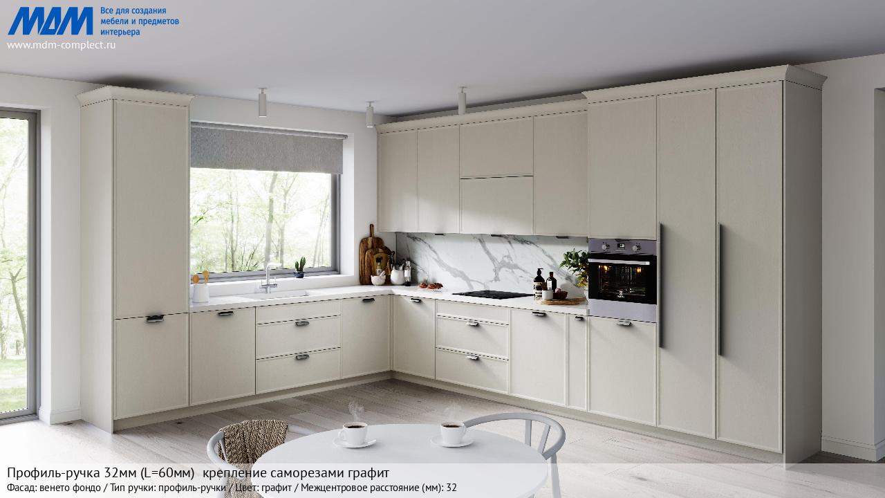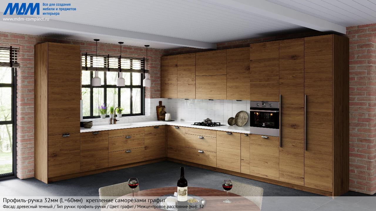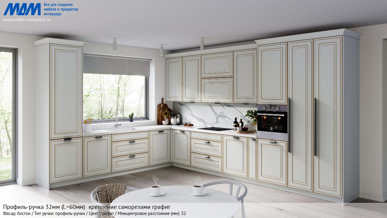 Мебельная Профиль-ручка 32мм (L=60мм) крепление саморезами графит на различных фасадах в кухонном интерьере в стиле классика, лофт, модерн.