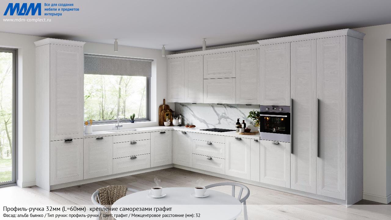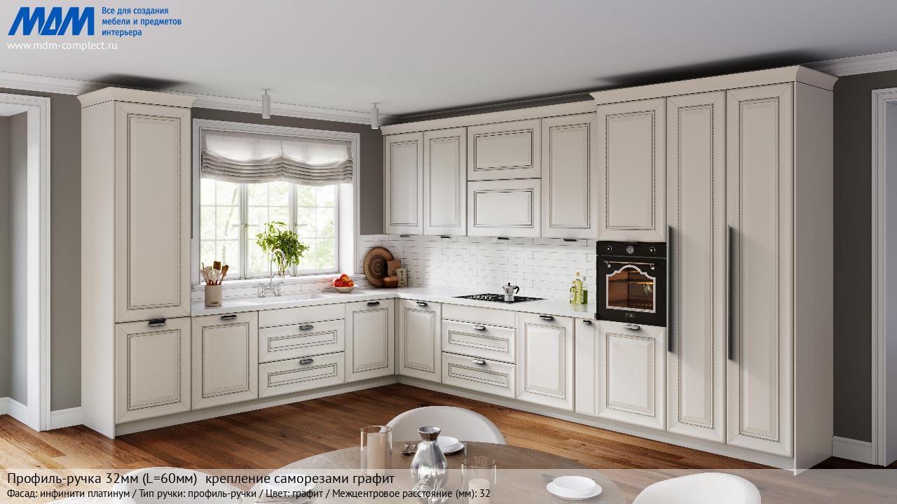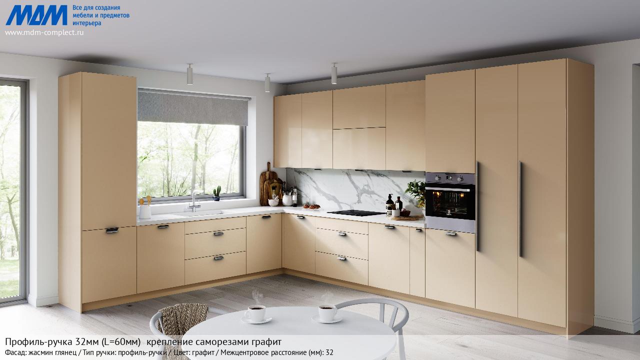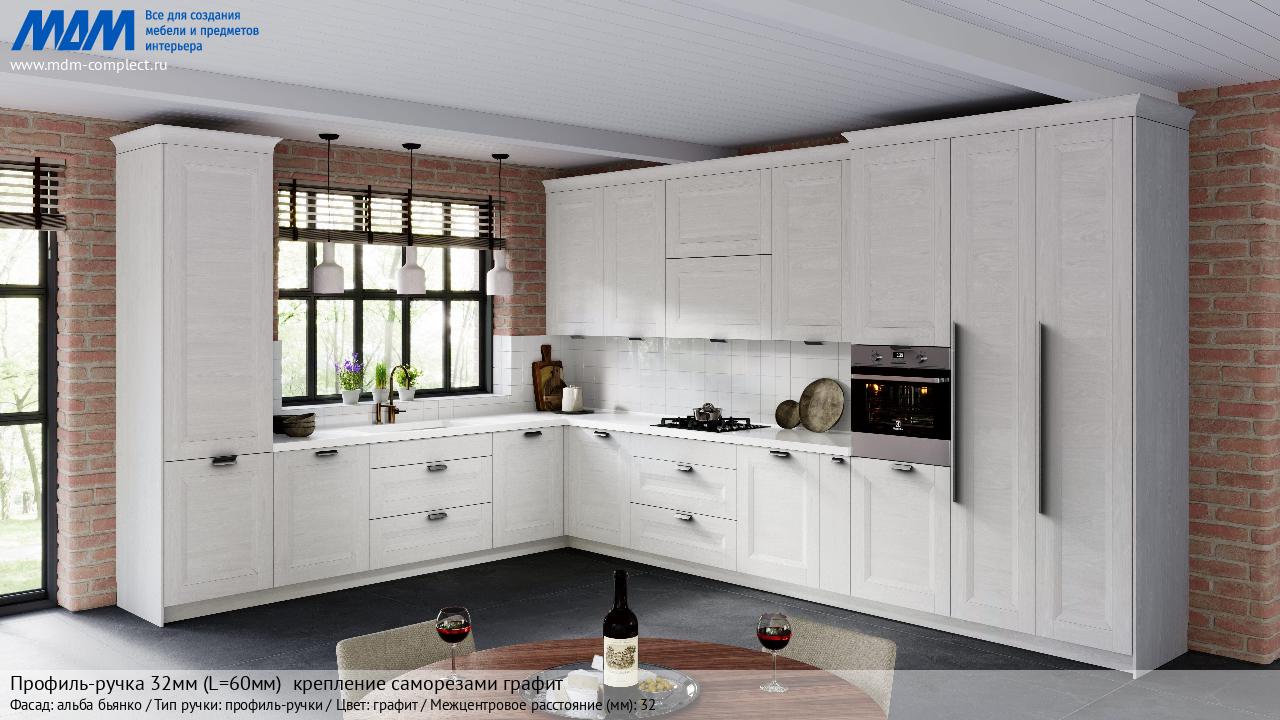 Мебельная Профиль-ручка 32мм (L=60мм) крепление саморезами графит на различных фасадах в кухонном интерьере в стиле классика, лофт, модерн.