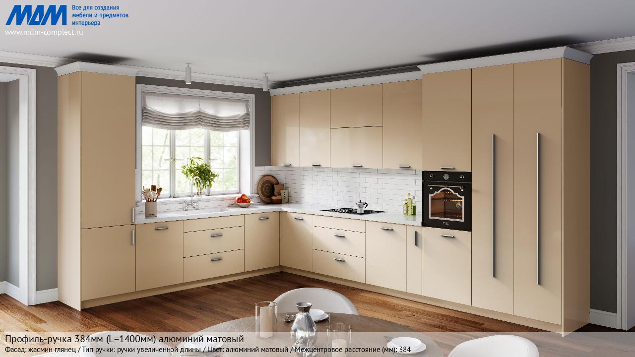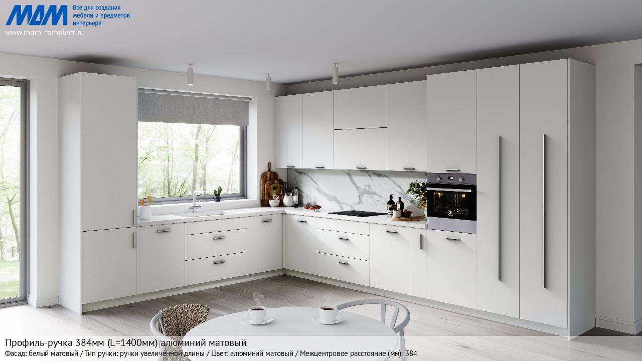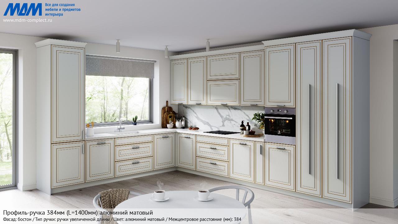 Мебельная Профиль-ручка 384мм (L=1400мм) алюминий матовый на различных фасадах в кухонном интерьере в стиле классика, лофт, модерн.