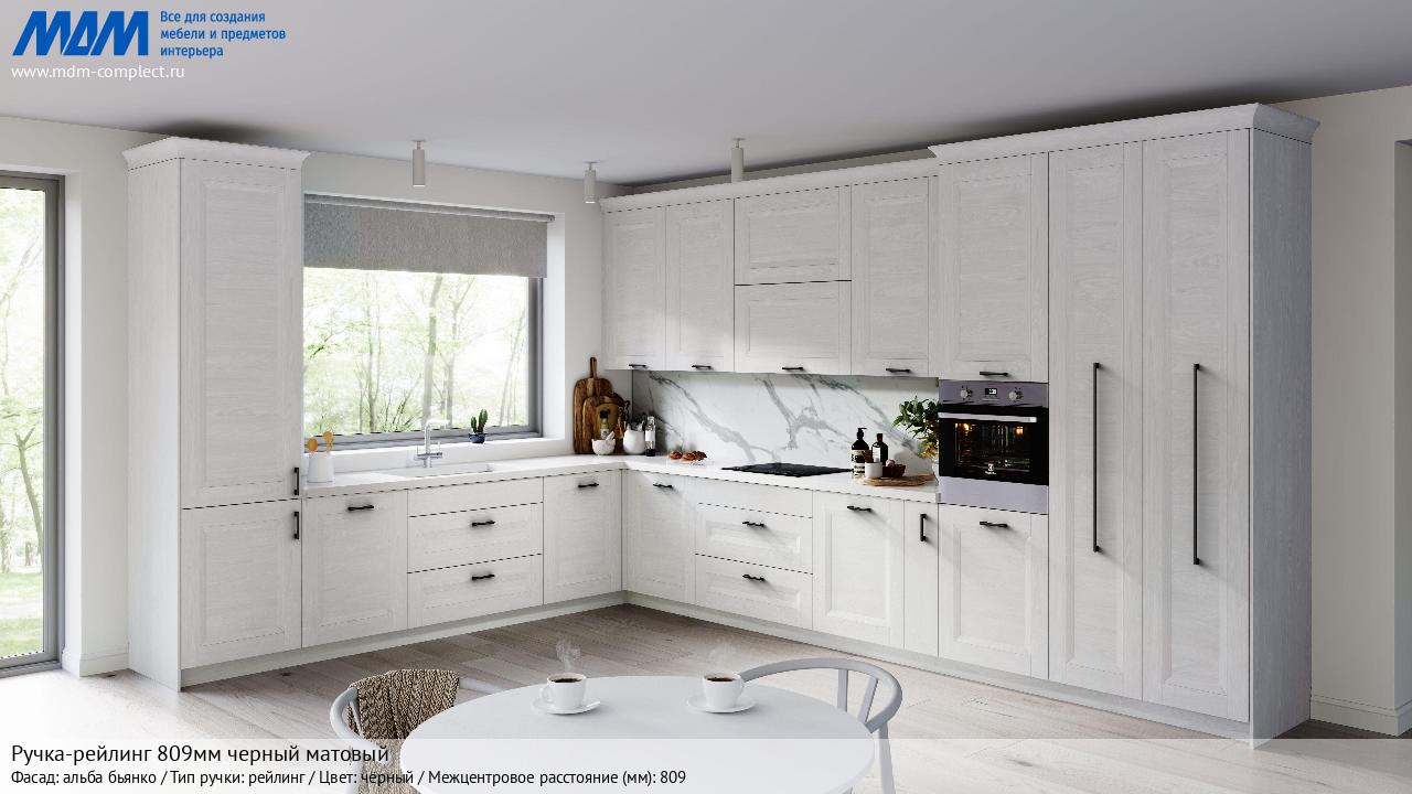 Мебельная Ручка-рейлинг 809мм черный матовый на различных фасадах в кухонном интерьере в стиле классика, лофт, модерн.