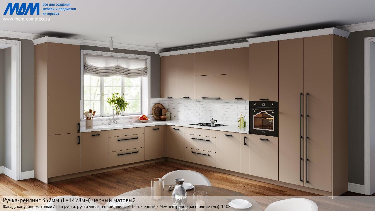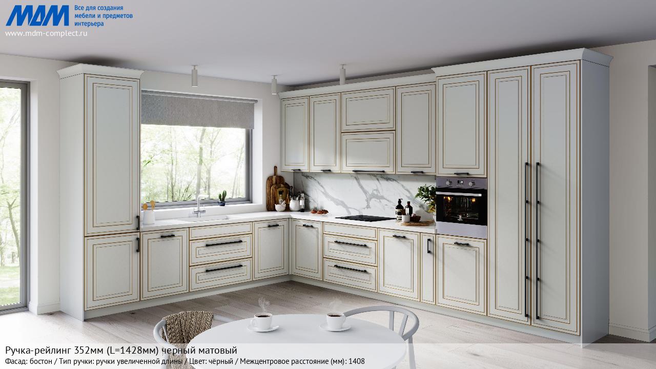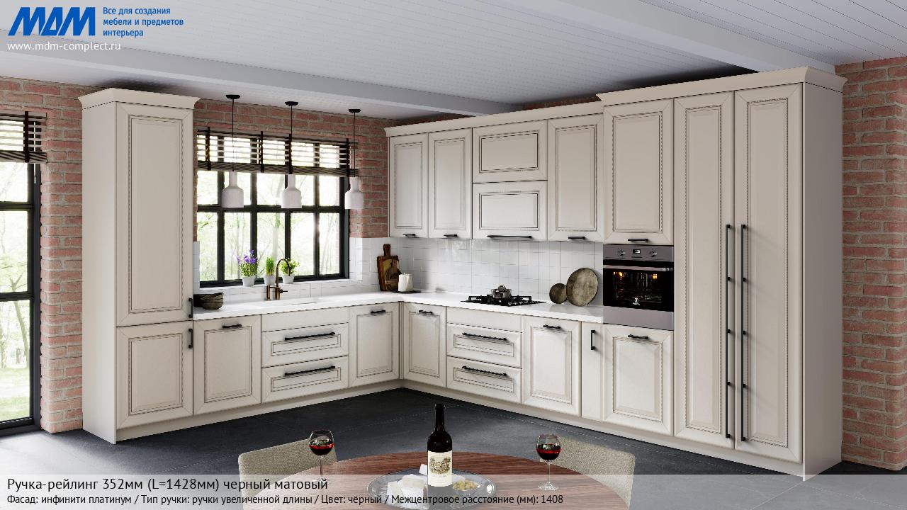 Мебельная Ручка-рейлинг 352мм (L=1428мм) черный матовый на различных фасадах в кухонном интерьере в стиле классика, лофт, модерн.