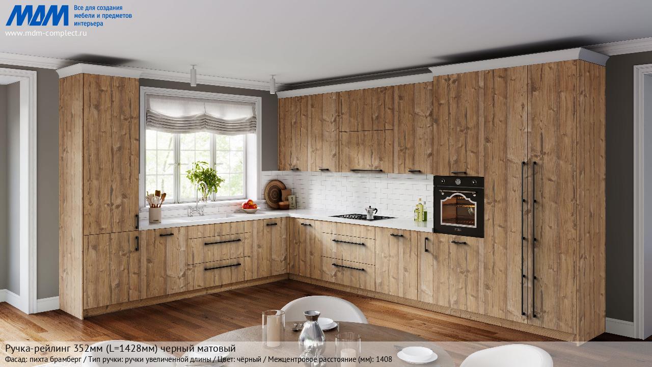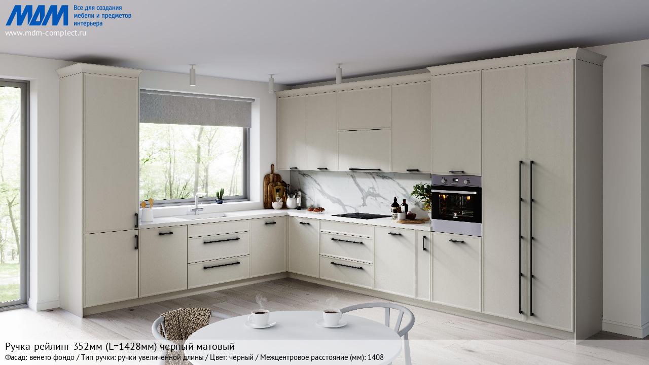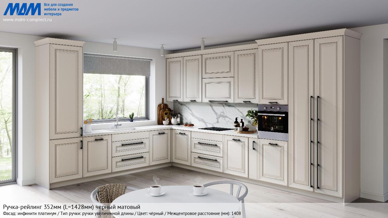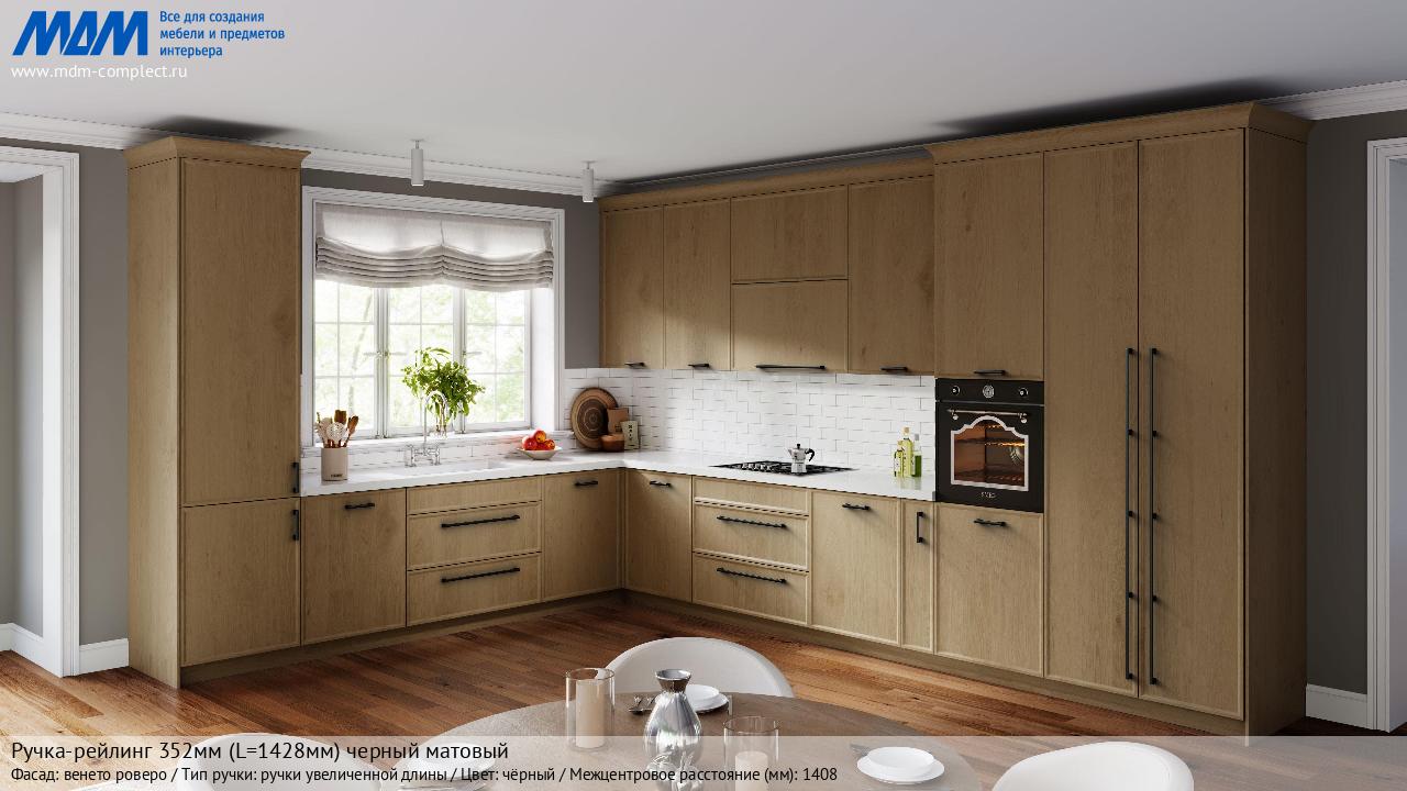 Мебельная Ручка-рейлинг 352мм (L=1428мм) черный матовый на различных фасадах в кухонном интерьере в стиле классика, лофт, модерн.