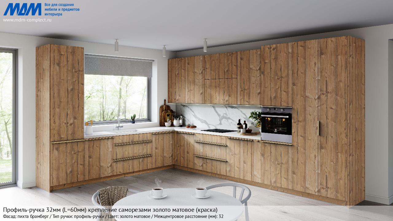 Мебельная Профиль-ручка 32мм (L=60мм) крепление саморезами золото матовое (краска) на различных фасадах в кухонном интерьере в стиле классика, лофт, модерн.