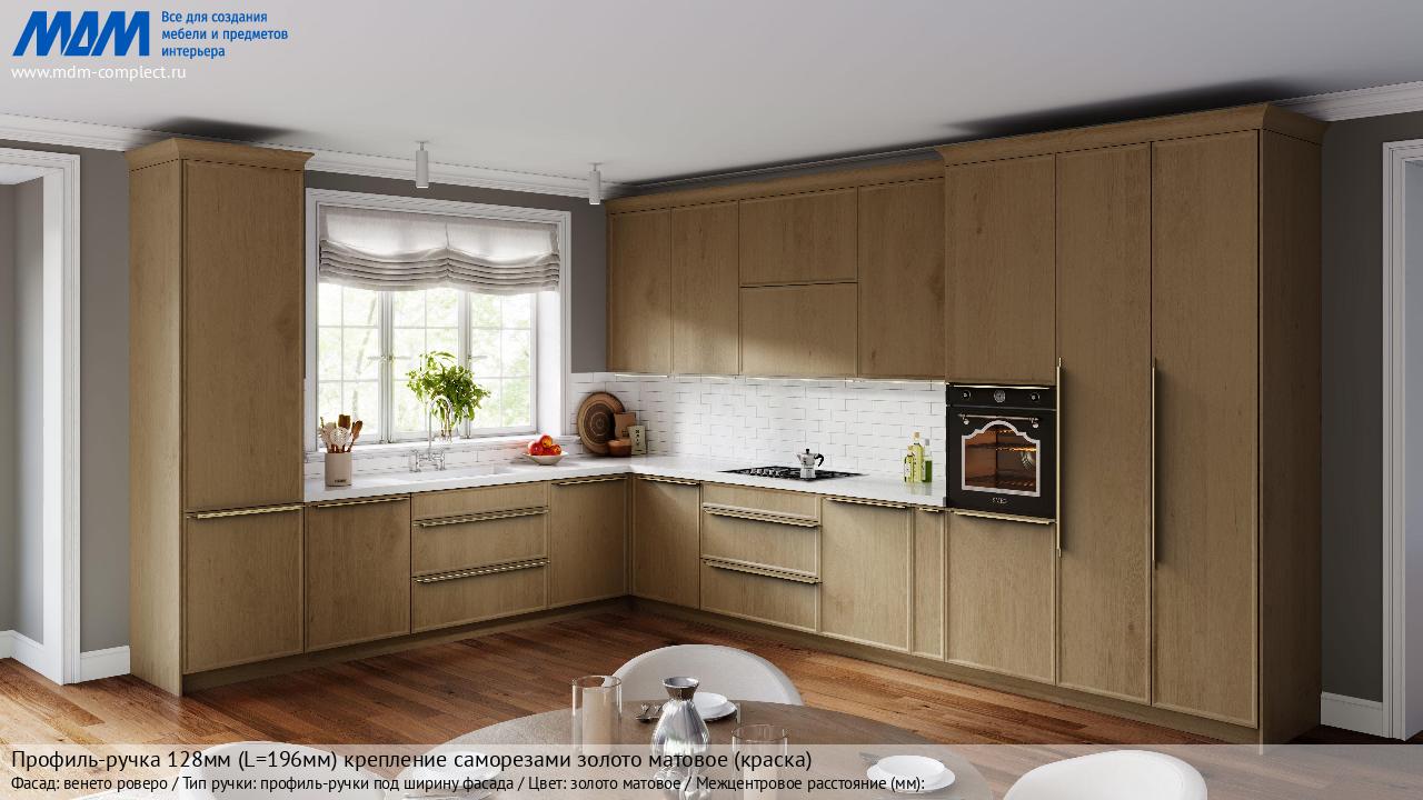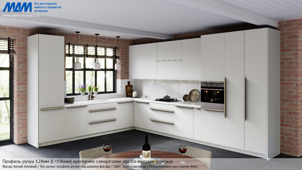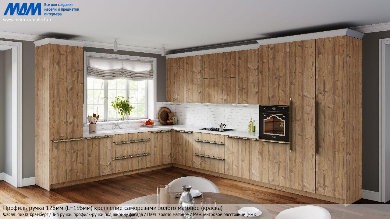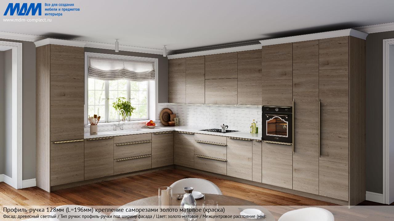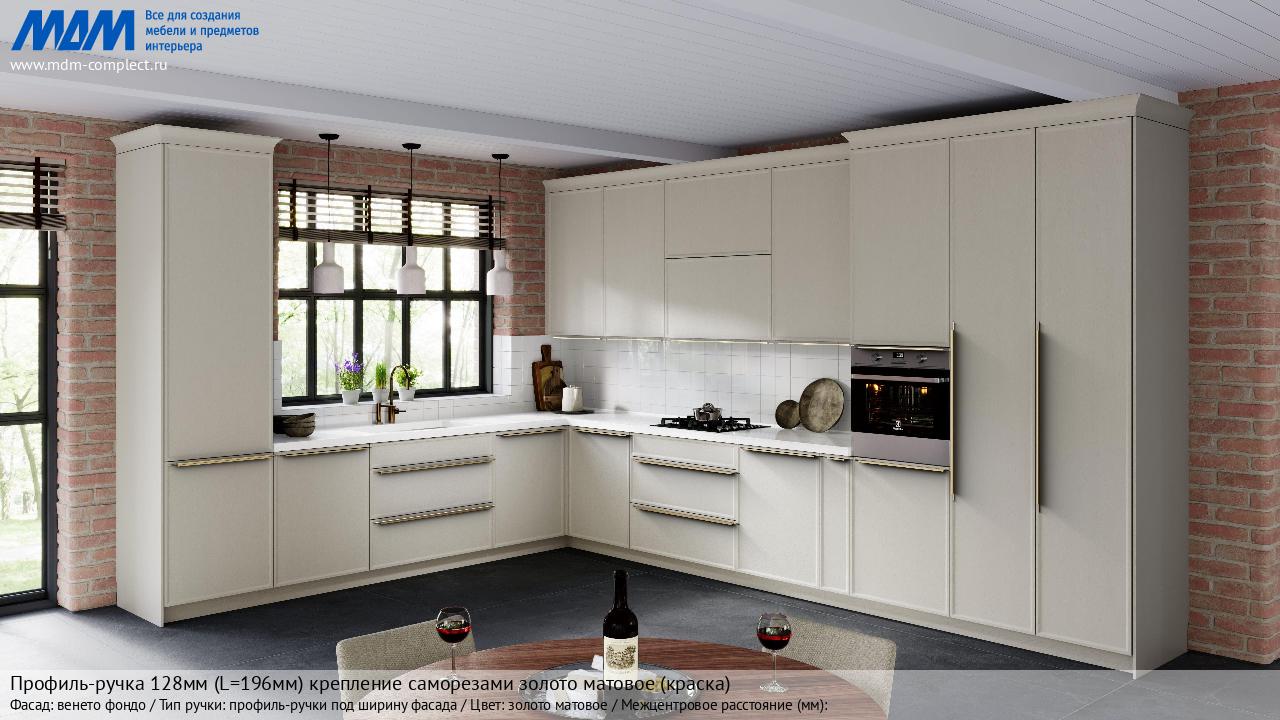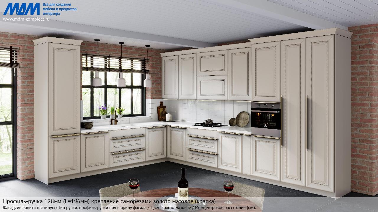 Мебельная Профиль-ручка 128мм (L=196мм) крепление саморезами золото матовое (краска) на различных фасадах в кухонном интерьере в стиле классика, лофт, модерн.