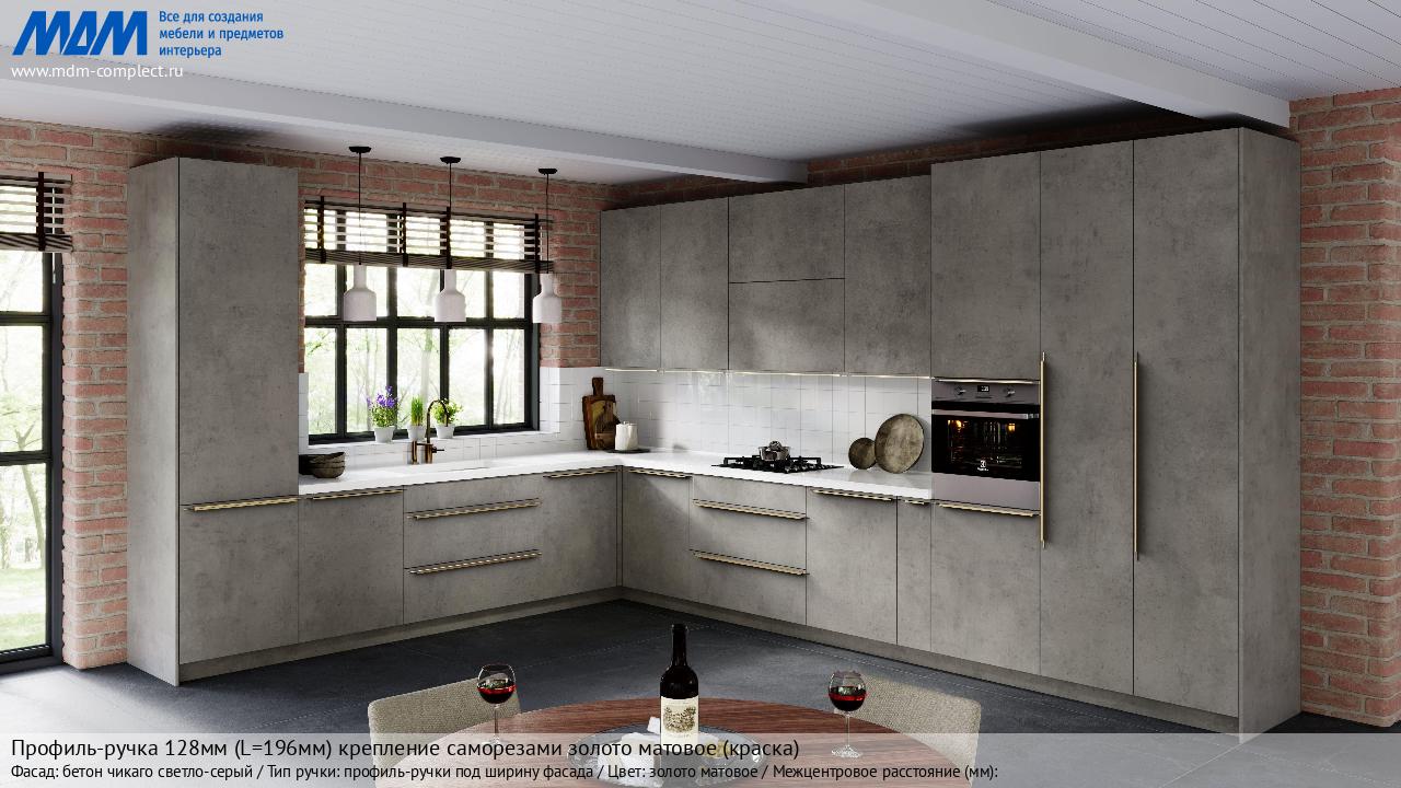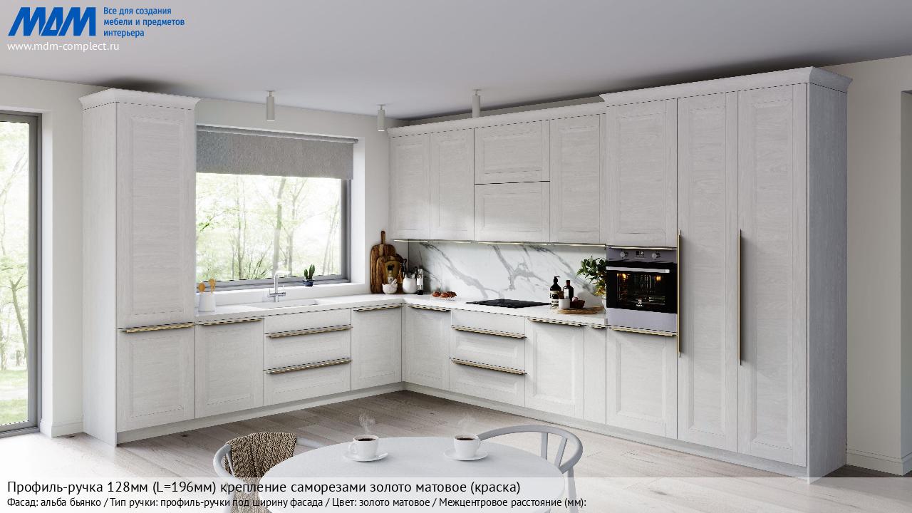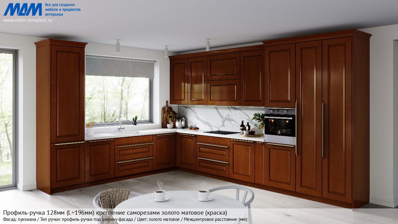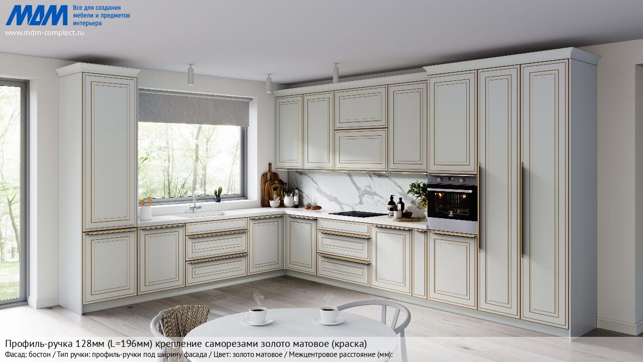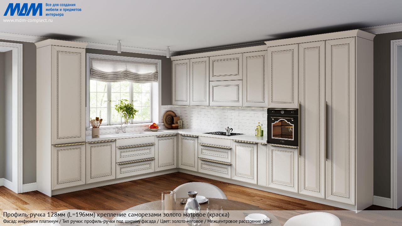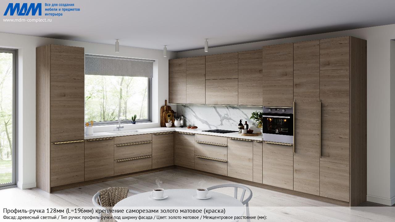 Мебельная Профиль-ручка 128мм (L=196мм) крепление саморезами золото матовое (краска) на различных фасадах в кухонном интерьере в стиле классика, лофт, модерн.