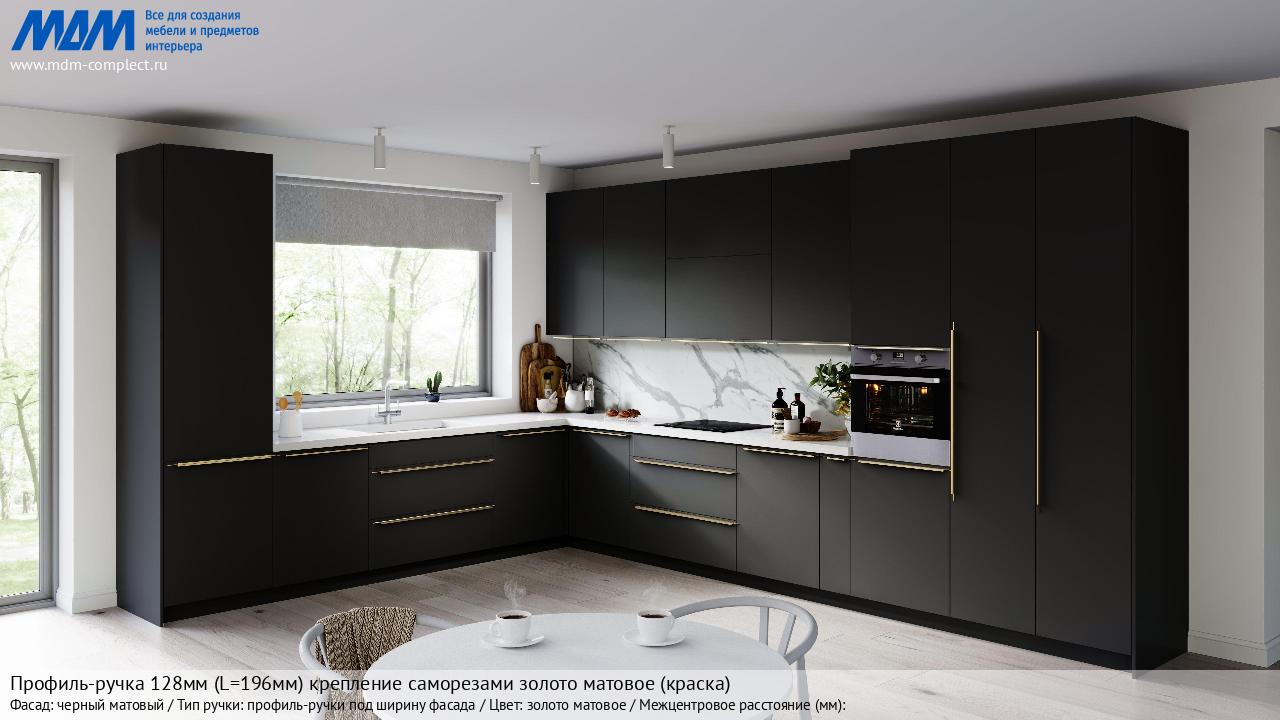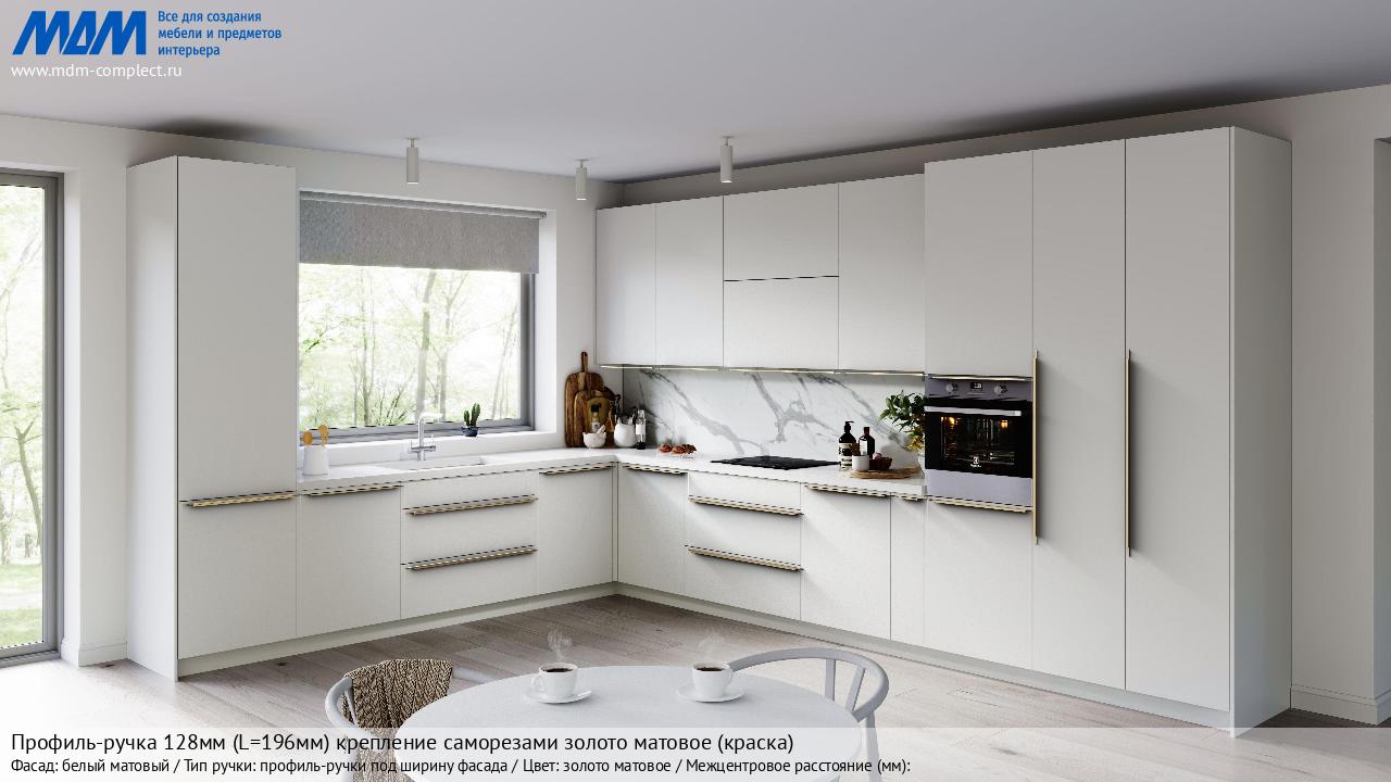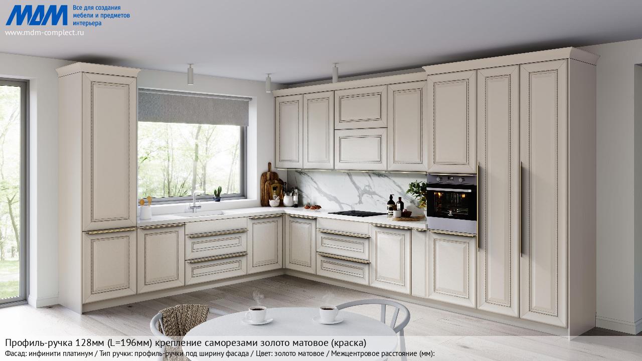 Профиль-ручка 128мм (L=196мм) крепление саморезами золото матовое (краска) (PH.RU13.200.GL) в готовой кухне на различных фасадах