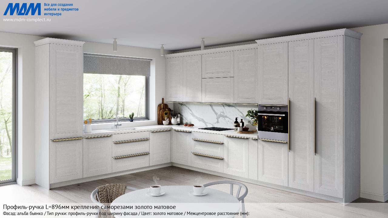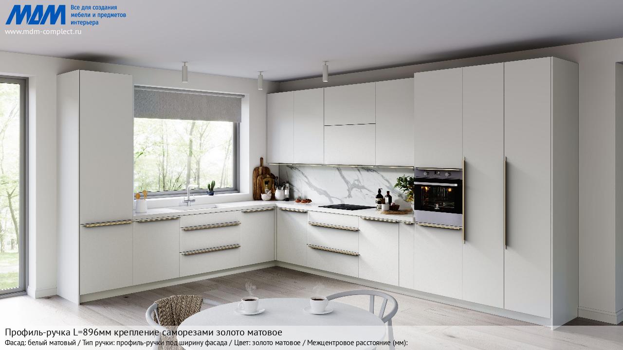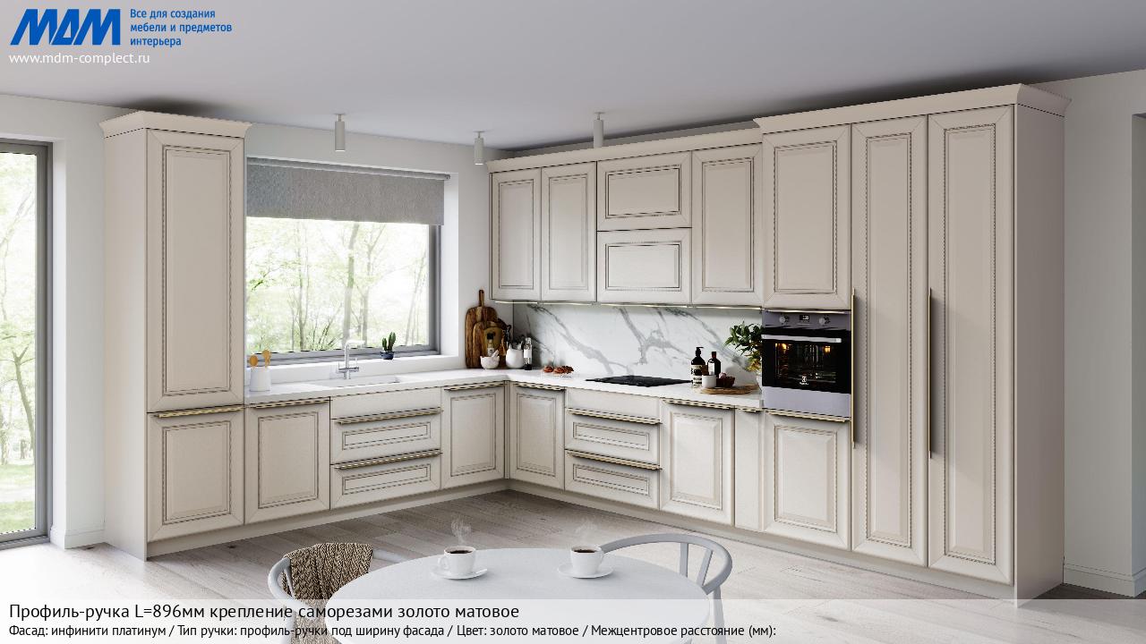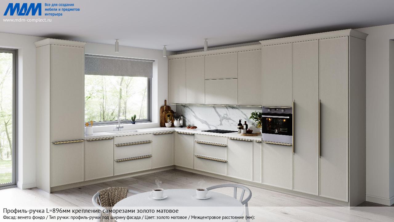 Мебельная Профиль-ручка L=896мм крепление саморезами золото матовое на различных фасадах в кухонном интерьере в стиле классика, лофт, модерн.