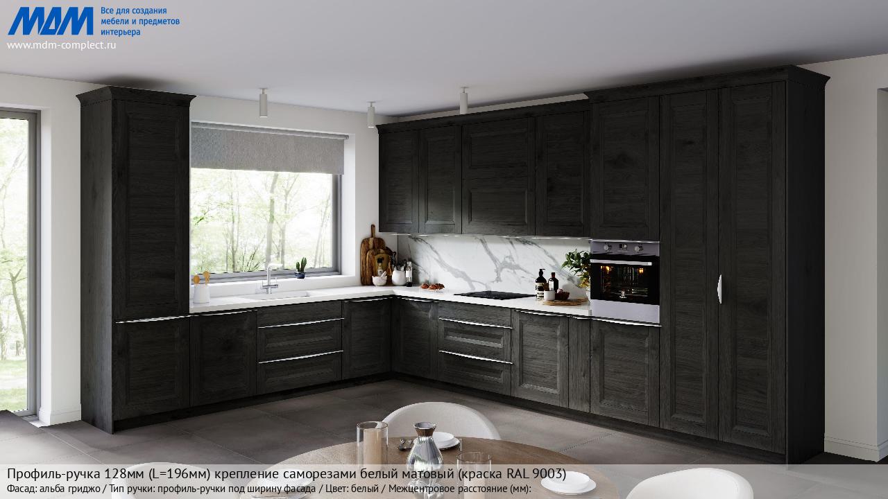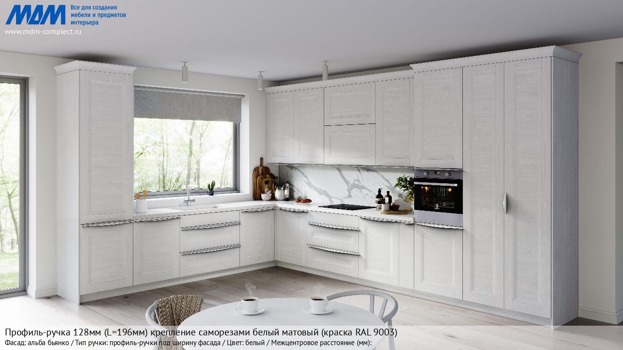 Мебельная Профиль-ручка 128мм (L=196мм) крепление саморезами белый матовый (краска RAL 9003) на различных фасадах в кухонном интерьере в стиле классика, лофт, модерн.