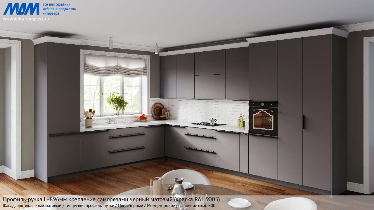 Мебельная Профиль-ручка L=896мм крепление саморезами черный матовый (краска RAL 9005) на различных фасадах в кухонном интерьере в стиле классика, лофт, модерн.